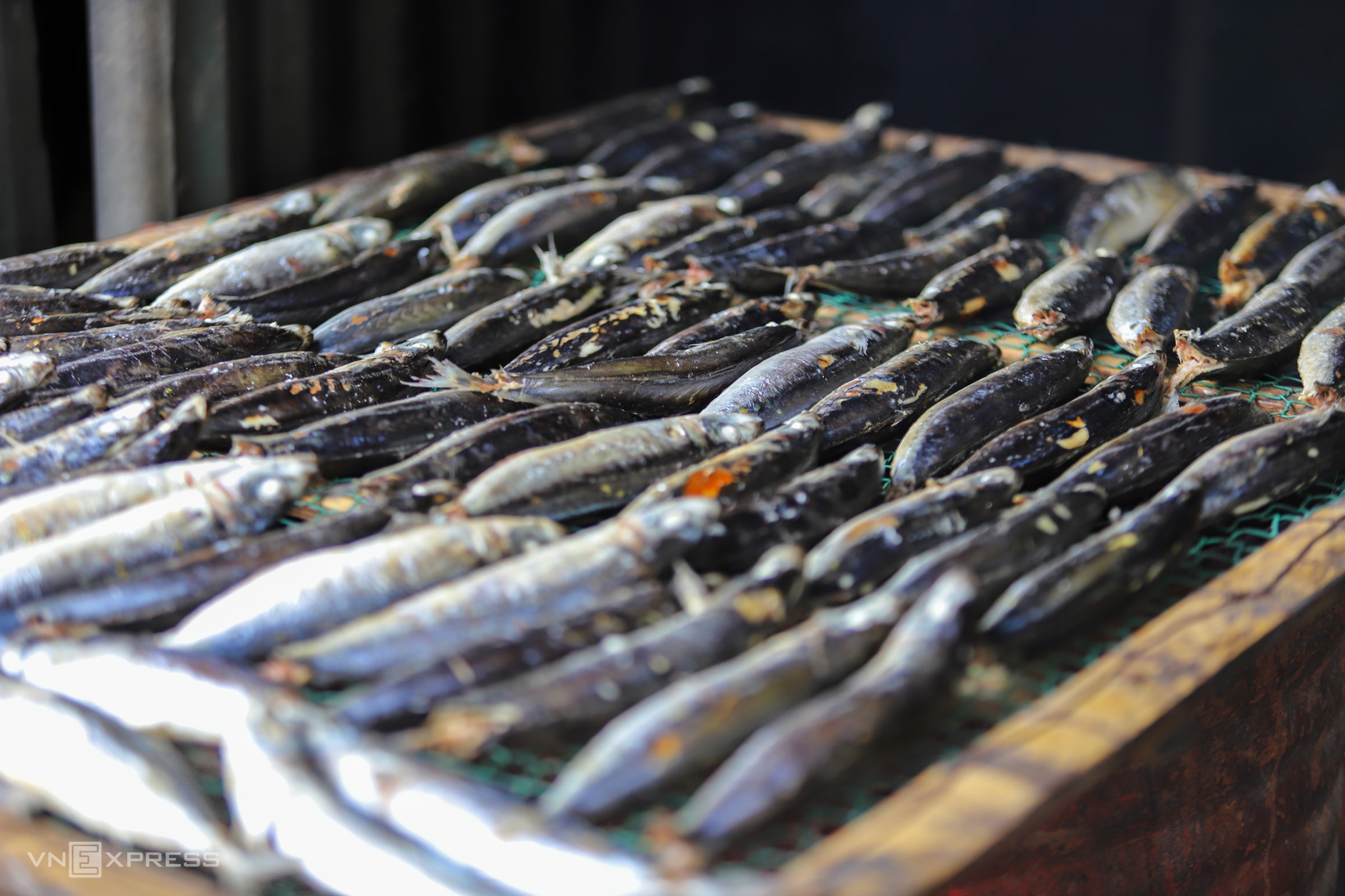 Cá sau khi sơ chế, phân loại được đặt lên giàn thép ven đường, phơi 3-5 tiếng cho ráo nước trước khi đưa vào lò.