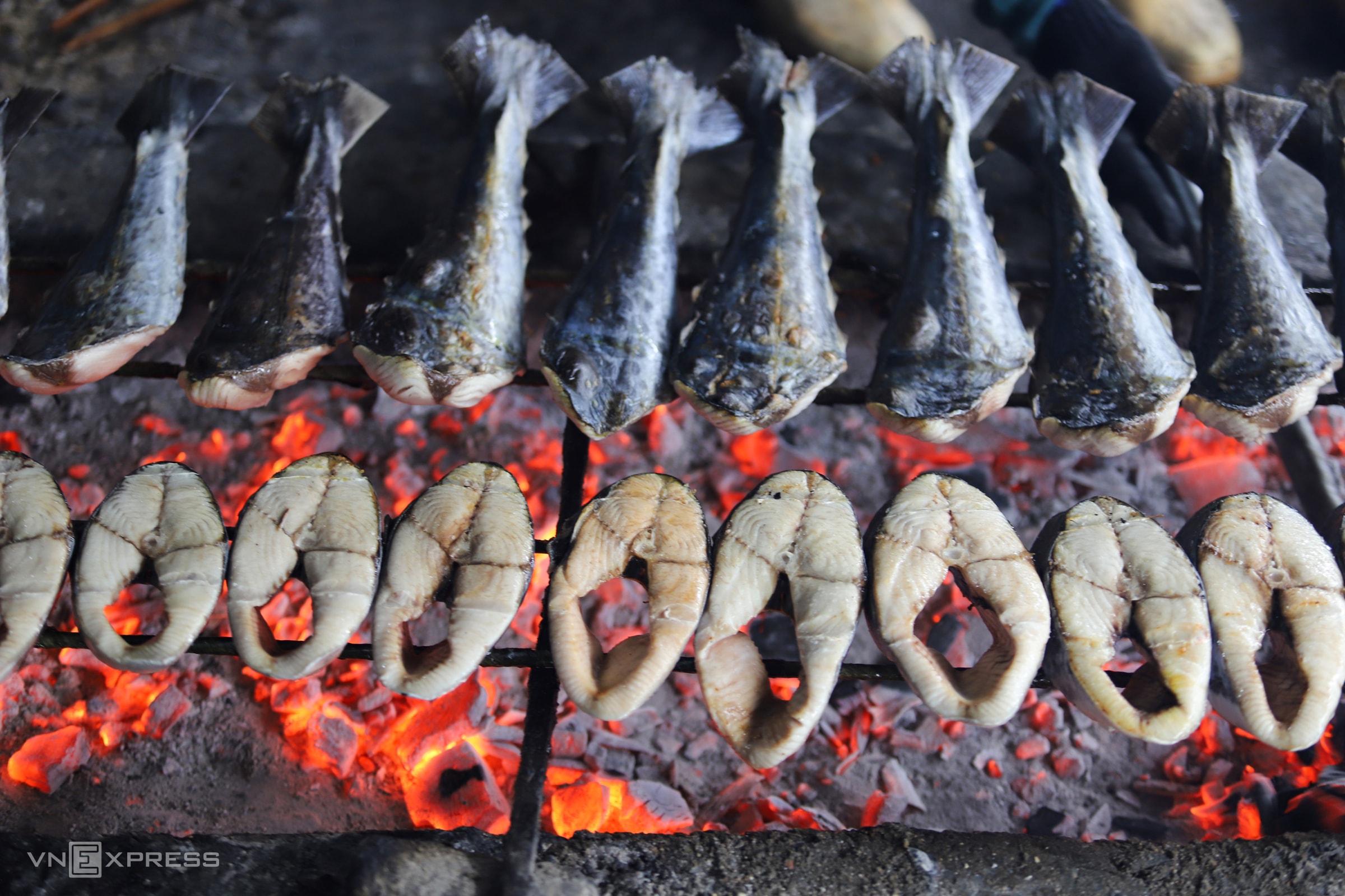 Mỗi mẻ cá nướng khoảng 50 miếng hoặc 50 con, tùy loại. Vỉ nướng đặt cách than 10-15 cm để tránh cháy. Chị Nguyễn Thị Luyến, thợ nướng cá, cho biết mỗi mẻ mất 5-10 phút, người nướng phải điều chỉnh lửa, lật đều tay. Cá đạt chuẩn khi bên ngoài ngả vàng, dậy mùi thơm, bên trong thịt dẻo, ăn ngọt và béo.