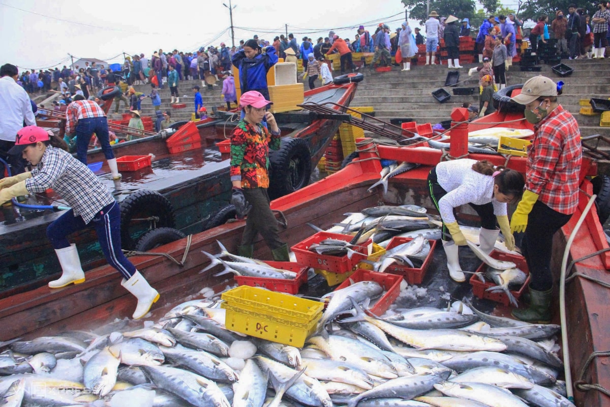 Khi tàu cập bến, khoang đầy ắp các loại cá như thu, bù, dược, chim, trích, thửng, chủ các cơ sở thay nhau trả giá, mua mỗi lần vài trăm kg rồi huy động người trong gia đình chở về nướng.