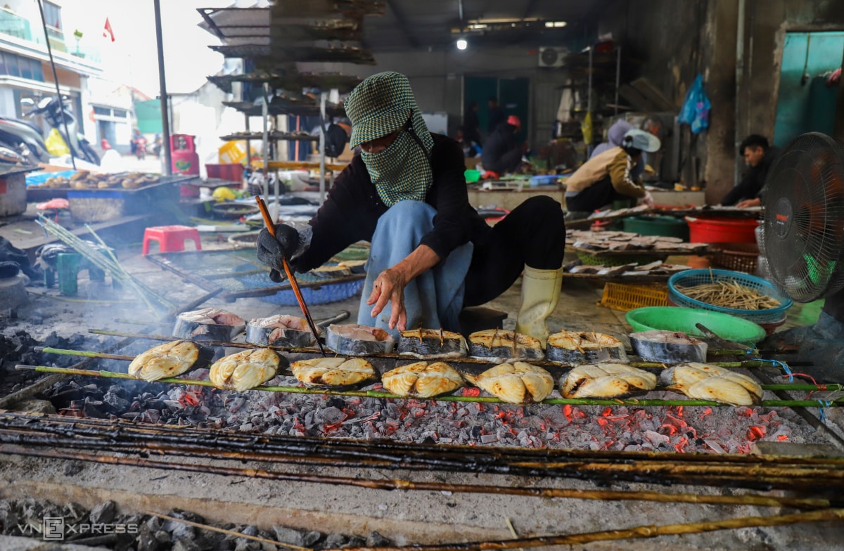 Người dân phường Cửa Lò nướng 400-800 kg cá các loại để bán Tết, doanh thu mỗi ngày hơn 50 triệu đồng, gấp 3-4 lần so với ngày thường.