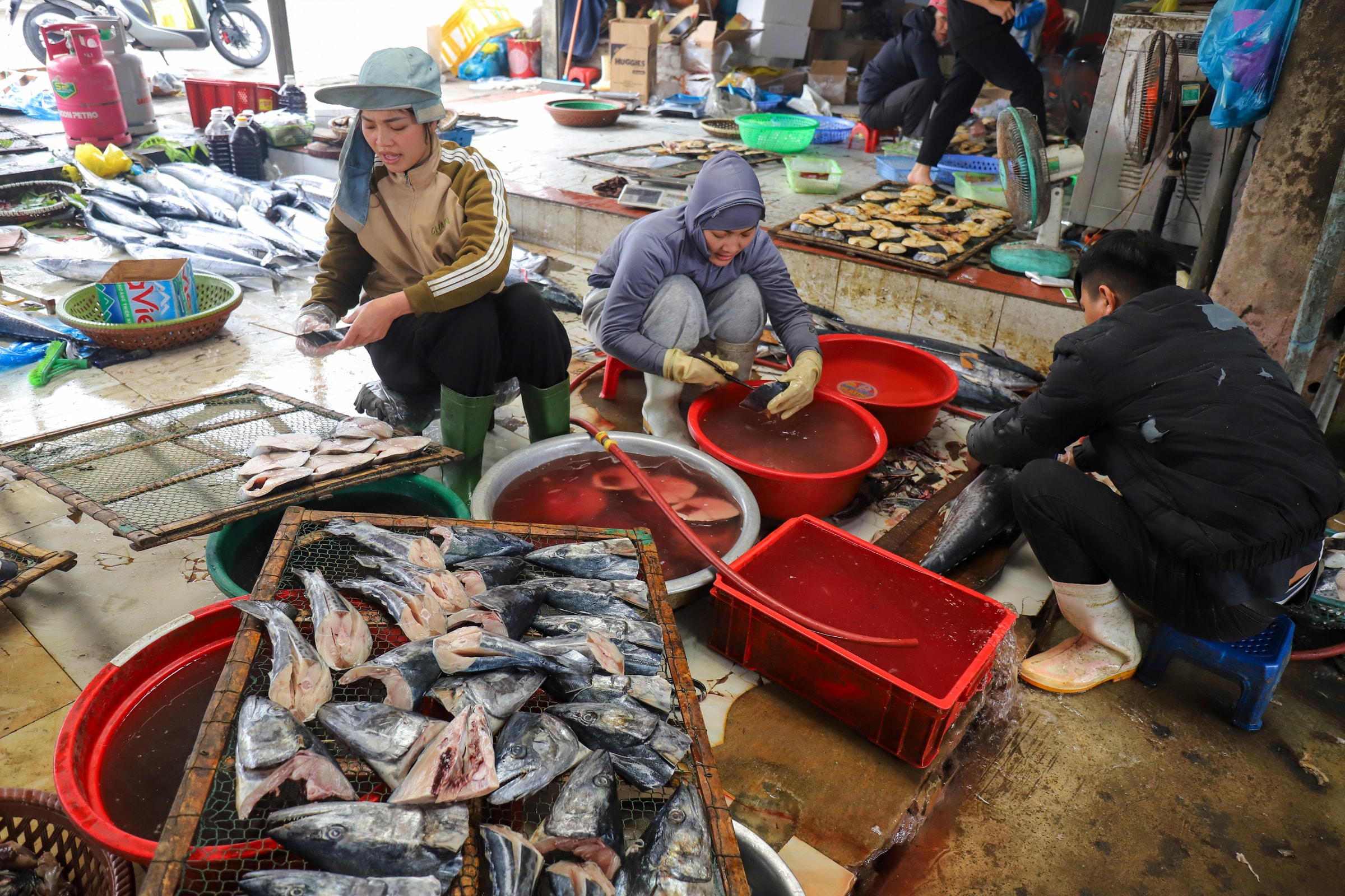 Bà Nguyễn Thị Loan, 50 tuổi, cho biết ngày thường chỉ sơ chế khoảng 100 kg cá, dịp cận Tết Bính Ngọ tăng lên 400-500 kg mỗi ngày.