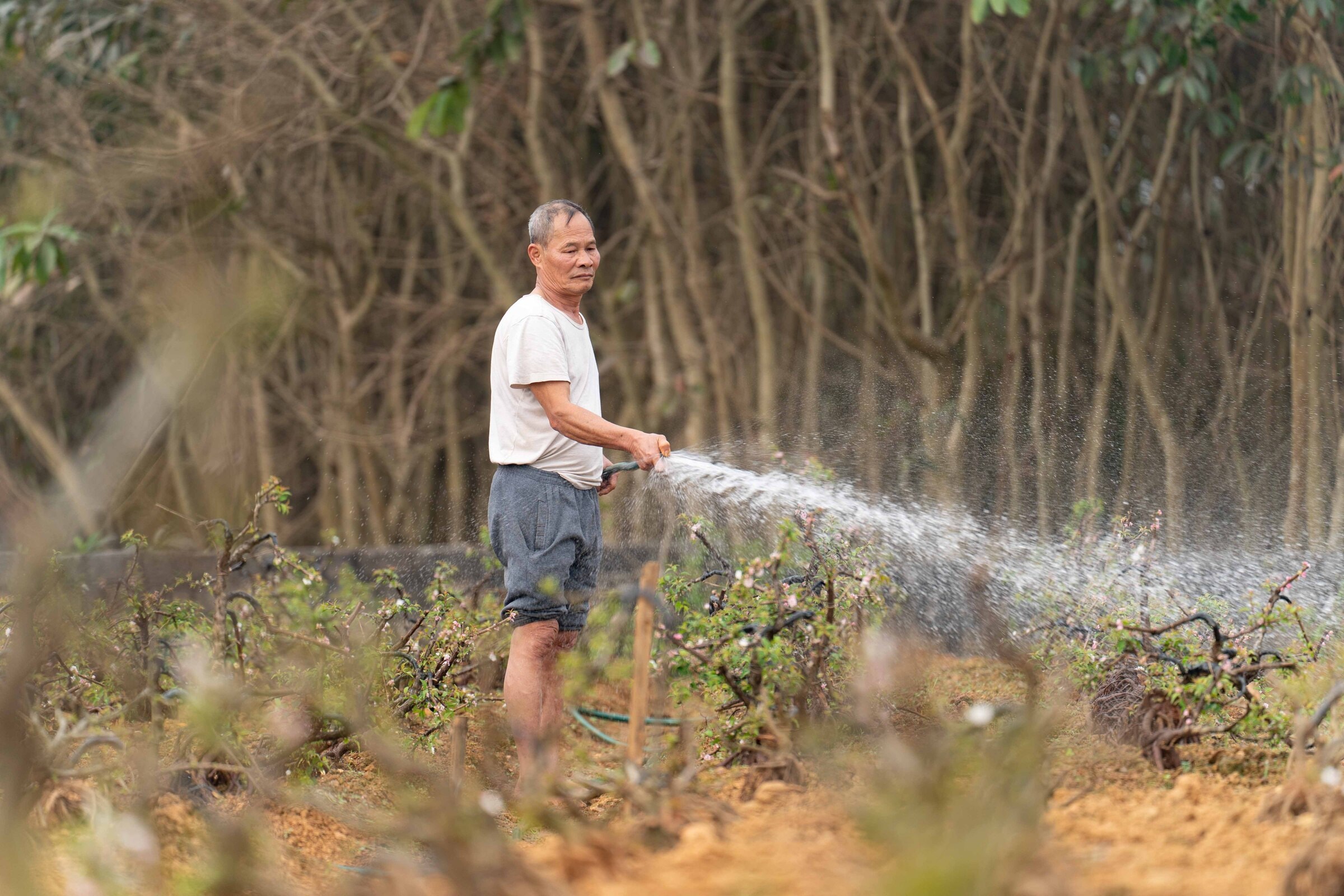 Ông Đỗ Quang Thơ, 66 tuổi, là một trong những người tiên phong trồng nhất chi mai ở làng. 30 năm trước, ông trồng hoa trong vườn nhà, diện tích khoảng 2.800 m2, sau đó mở rộng lên 3,6 ha.