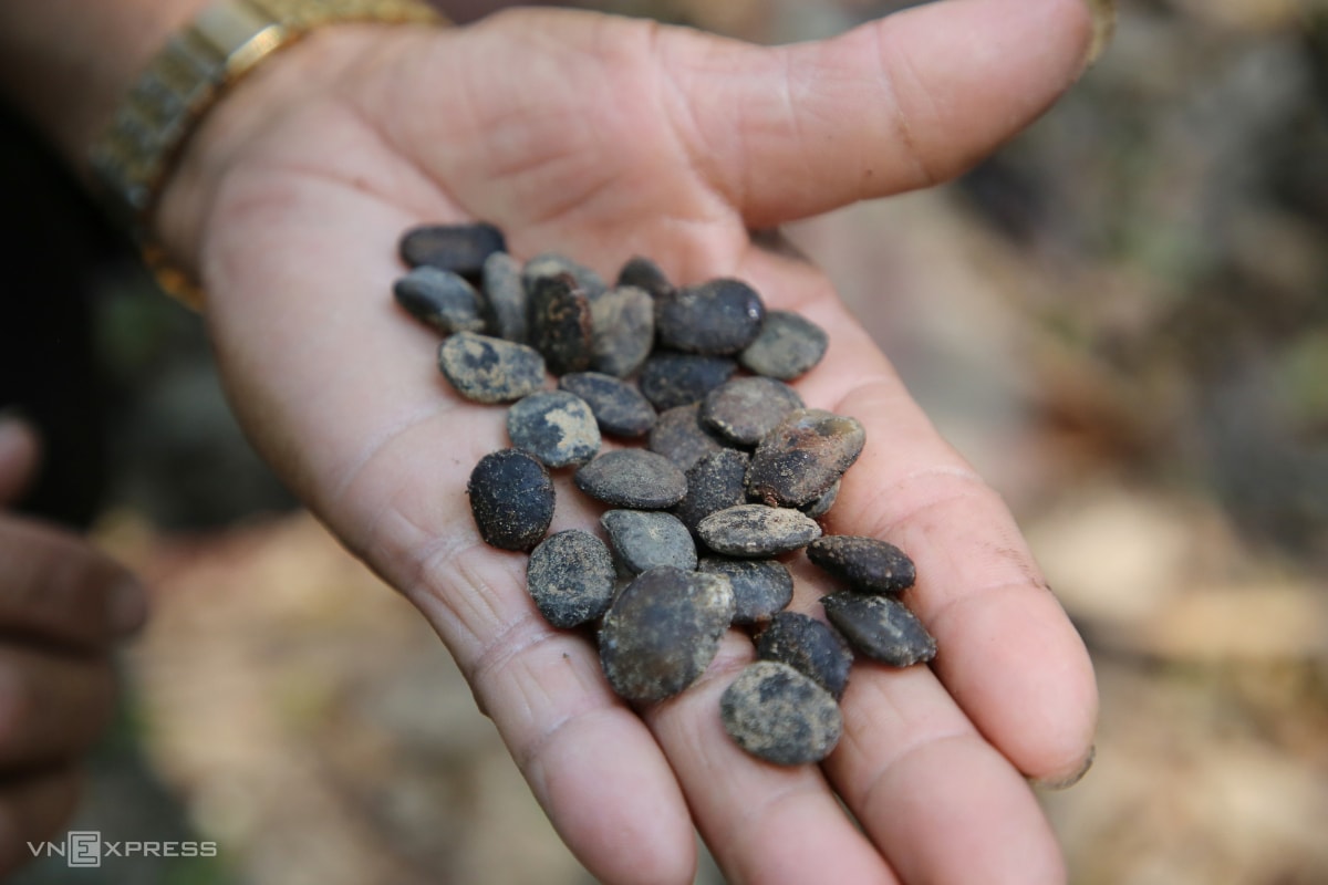 Tìm kiếm dưới thực bì, ông Đô lấy được hàng chục hạt lim, có thể dùng để gây giống.