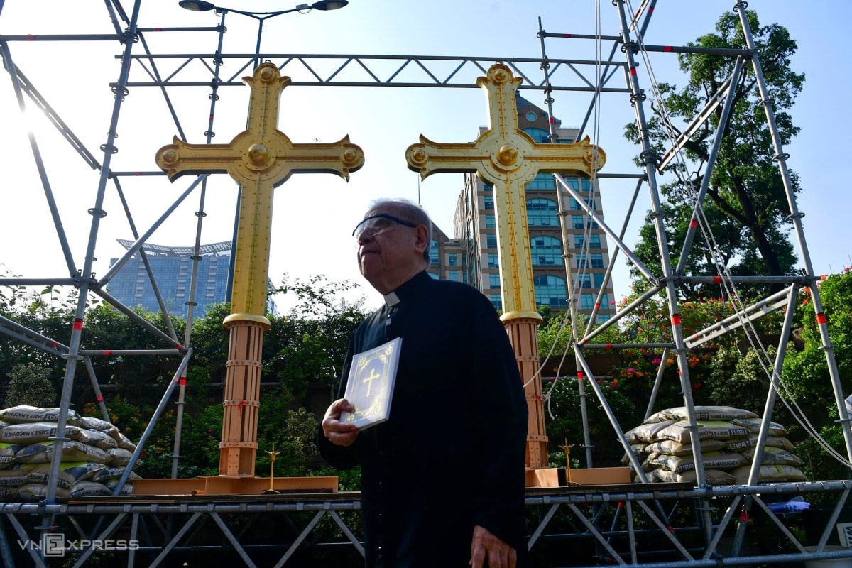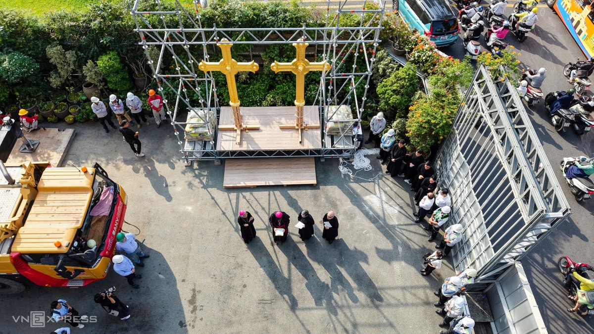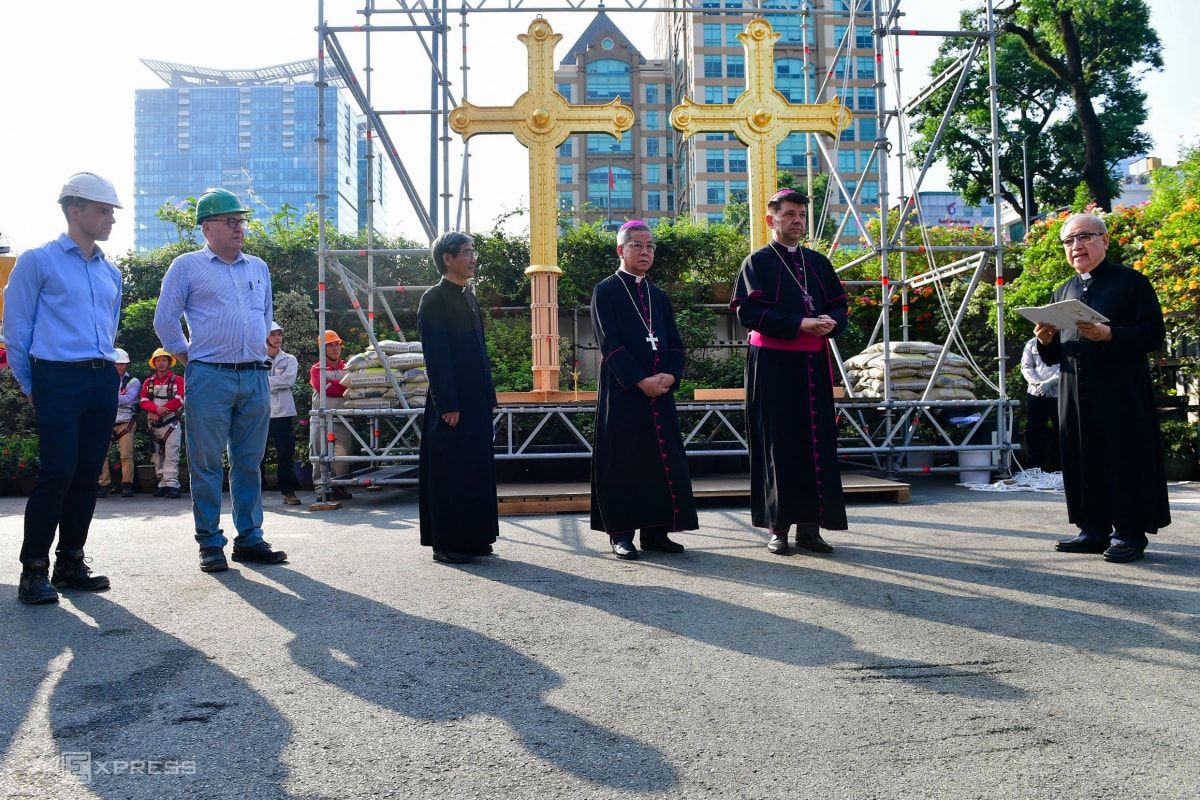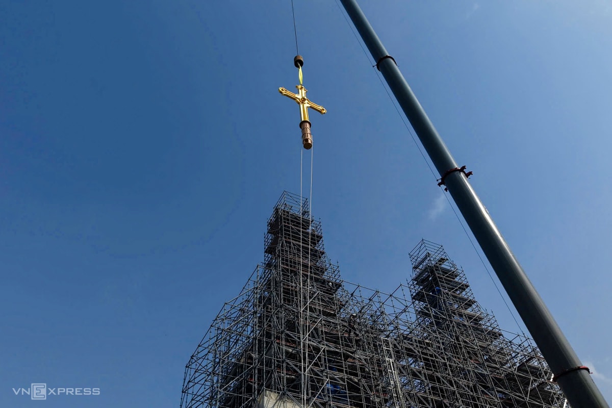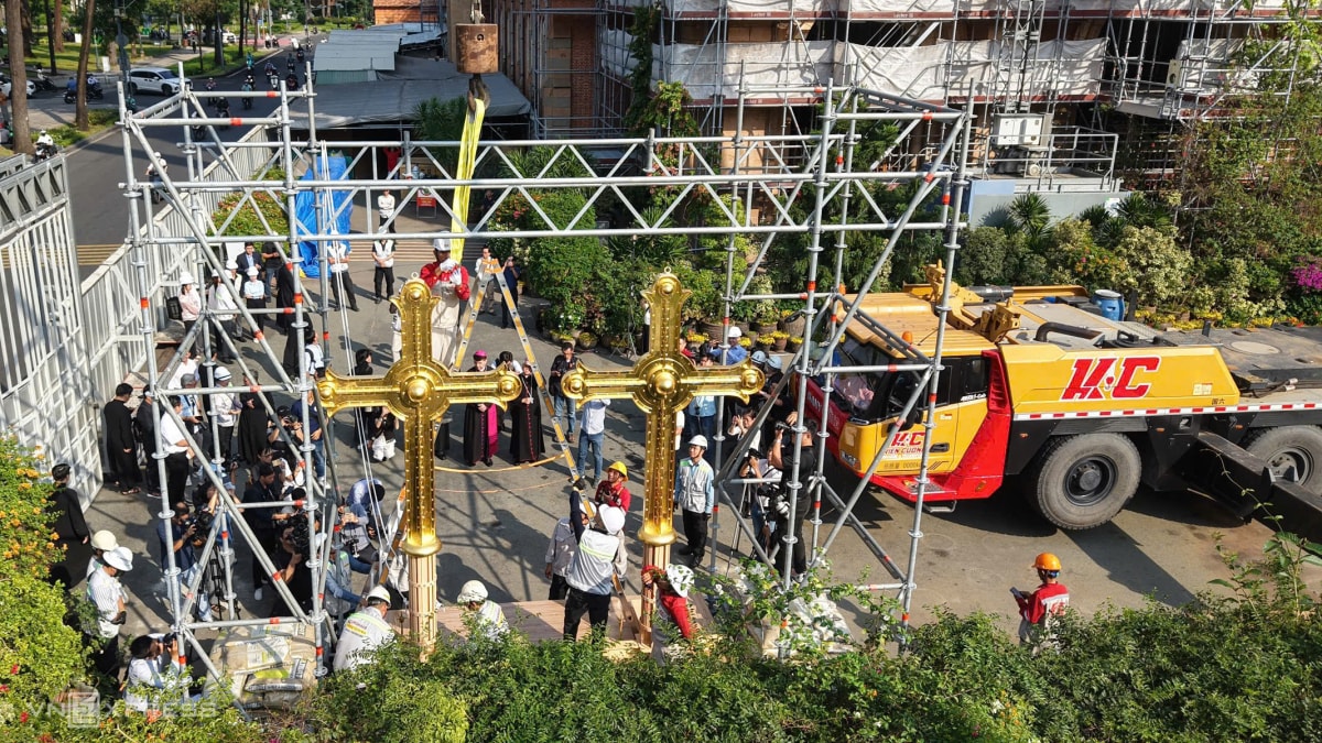 Lúc 8h, Đức cha Giuse Nguyễn Năng, Tổng giám mục Tổng giáo phận TP HCM cùng Đức cha Marek Zalewski, đại diện Tòa thánh thường trú tại Việt Nam, làm lễ đặt hai thánh giá mạ vàng nặng 400 kg, cao hơn 3,7 m lên đỉnh tháp kẽm nhà thờ.
