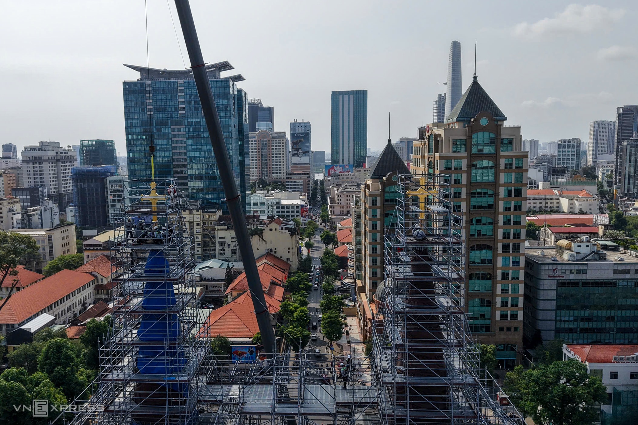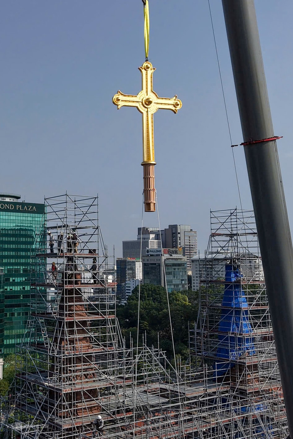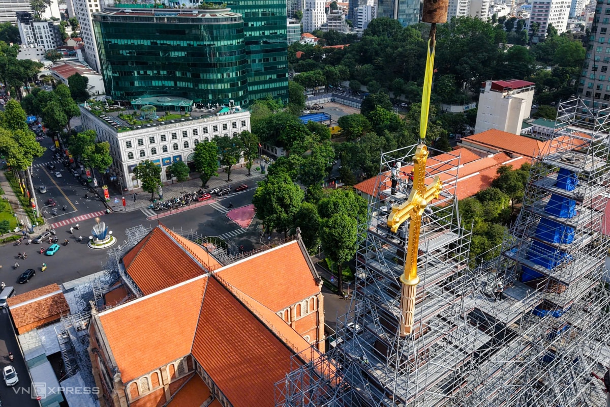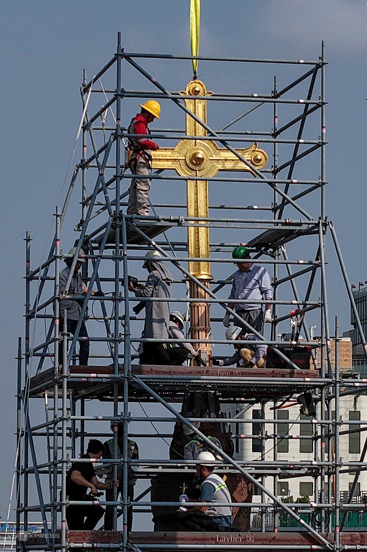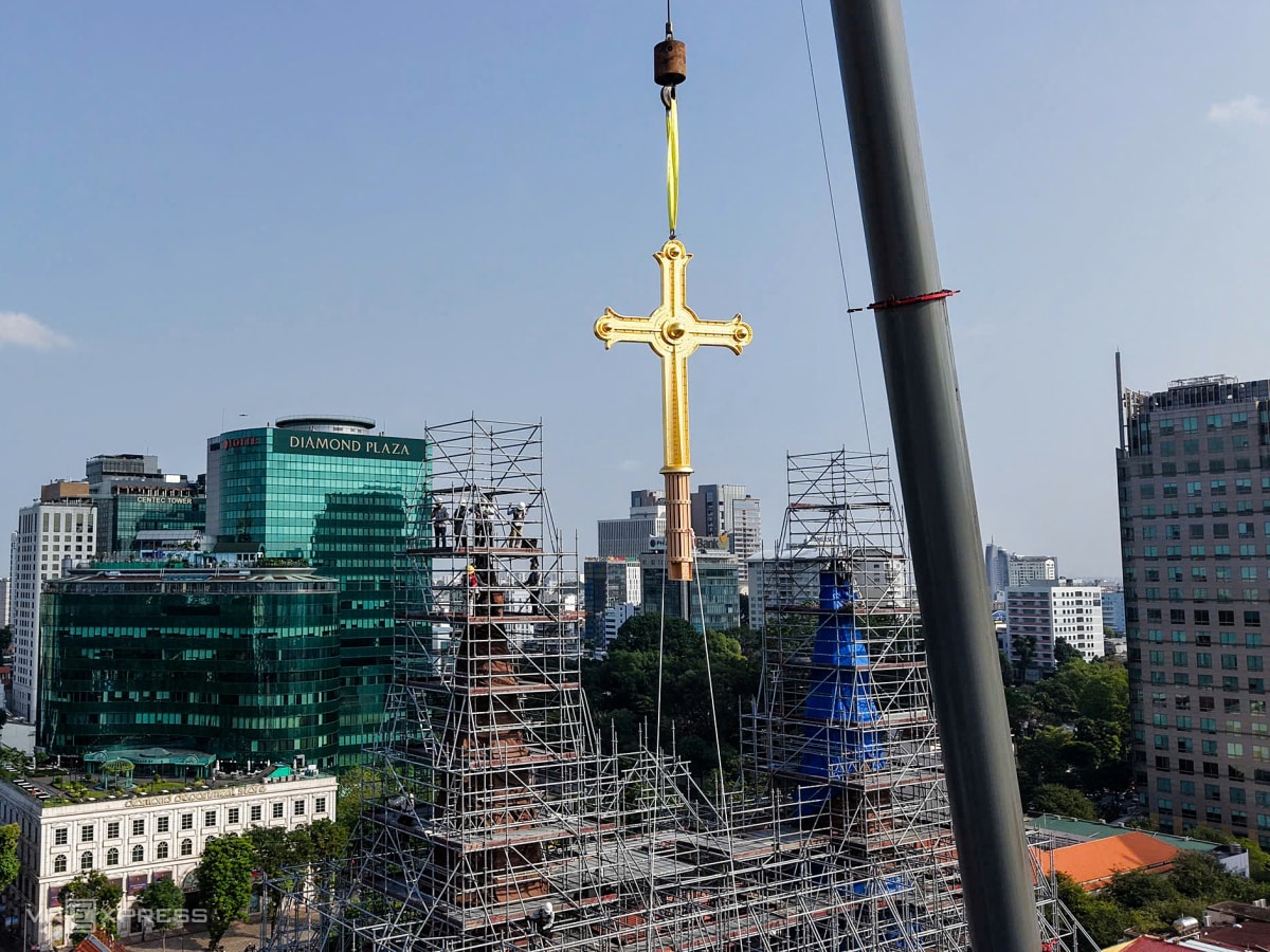 Lắp thánh giá mạ vàng lên tháp cao 57 m Nhà thờ Đức Bà Sài Gòn