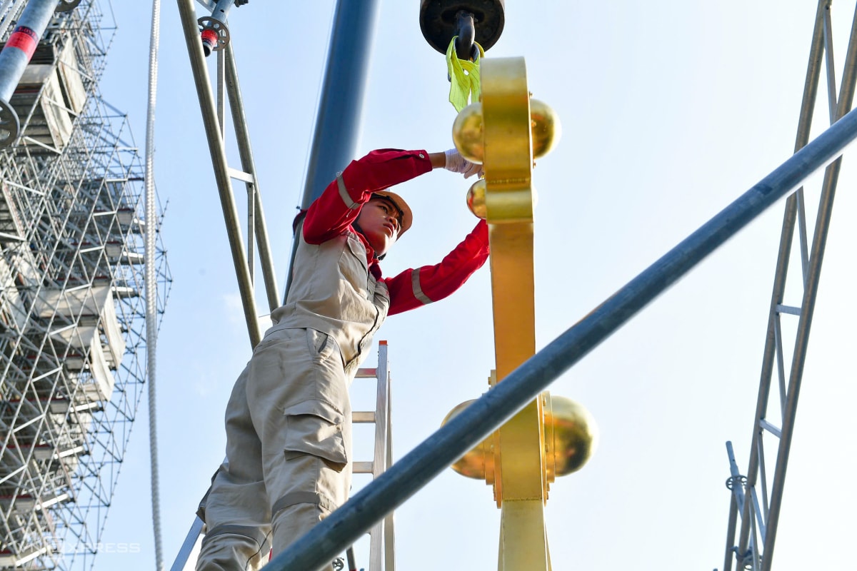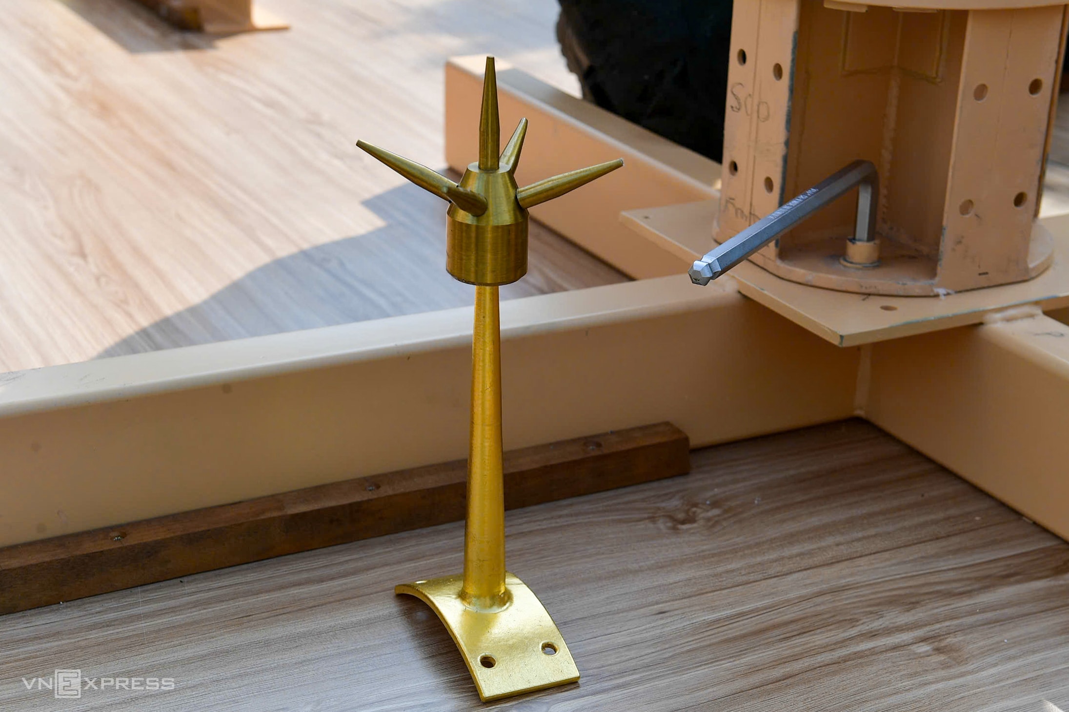 Các kỹ sư lắp chân đế thánh giá lên tháp kẽm sau đó vặn ốc cố định.
