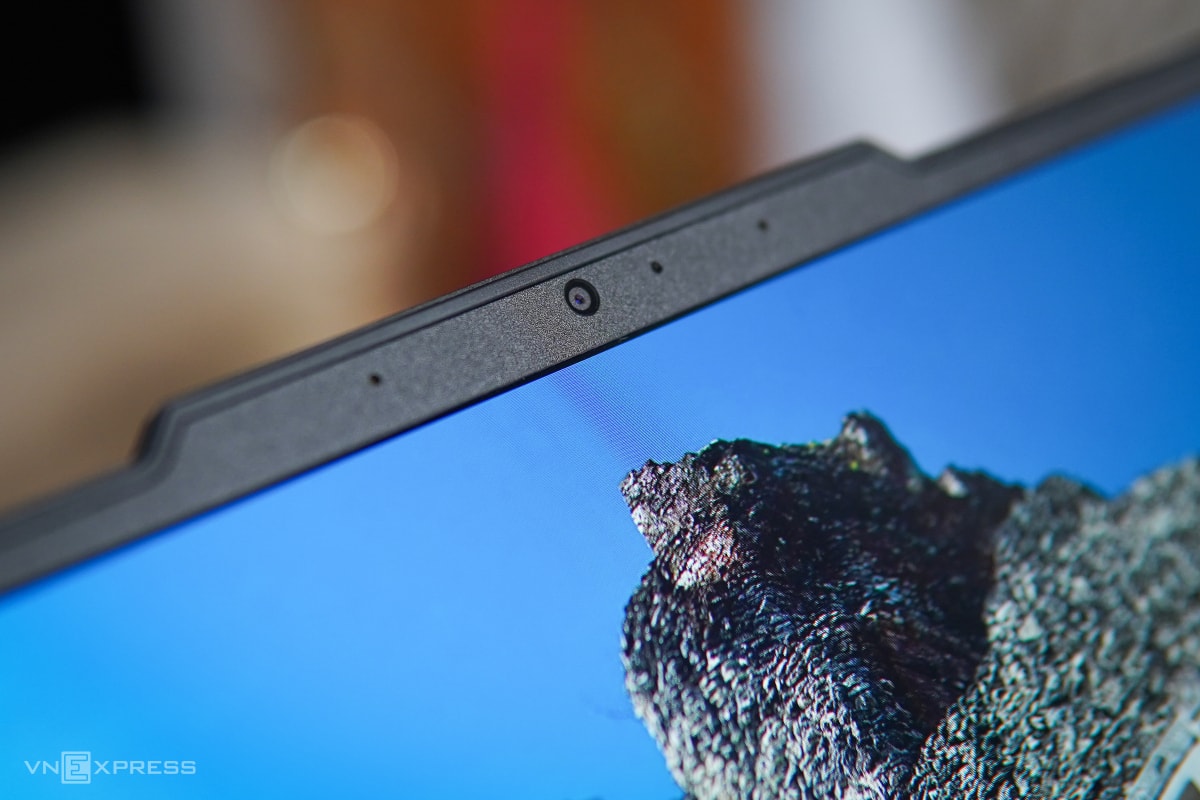 Phía trên là cụm camera, micro được làm lồi khỏi thân máy. Camera có độ phân giải Full HD và không đi kèm cảm biến hồng ngoại như một số máy khác của Lenovo. Chất lượng camera ở mức trung bình, phù hợp họp online. Với nhu cầu ghi hình, như các streamer, người dùng nên trang bị thêm camera ngoài để tăng cường chất lượng và sự linh hoạt.