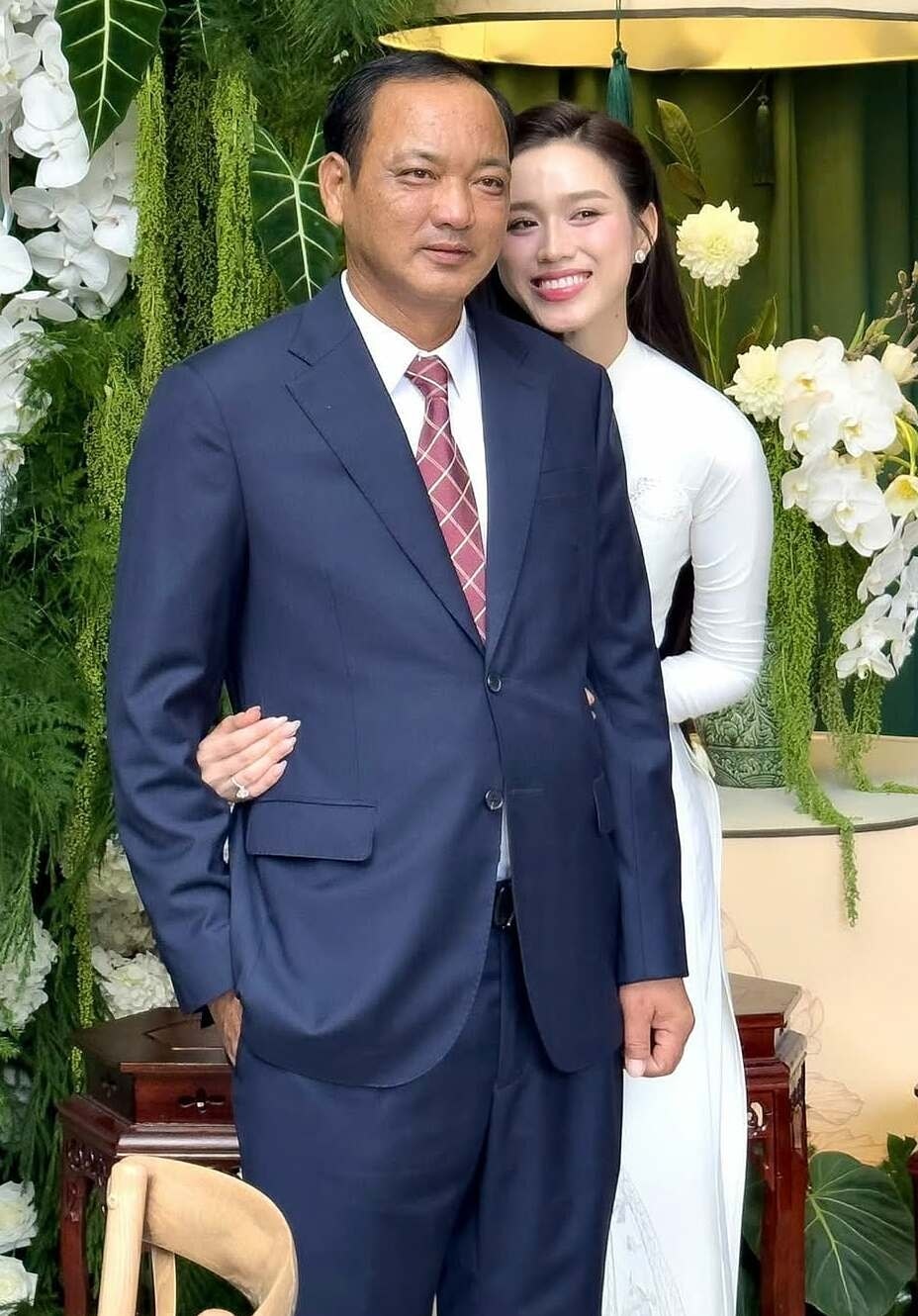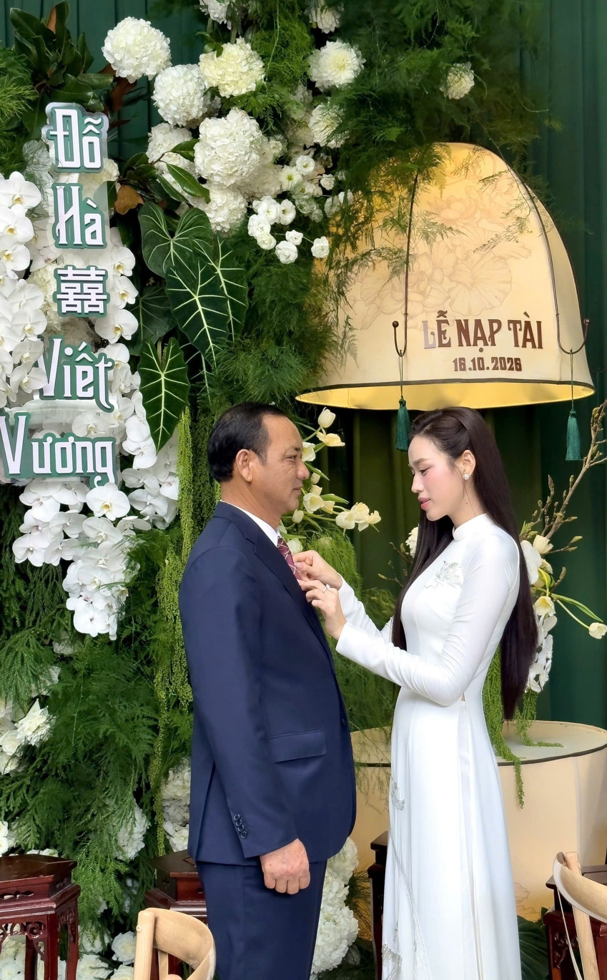 Cô chỉnh sửa trang phục cho bố trước khi nhà trai tới. Hoa hậu cho biết luôn khắc ghi lời dạy của bố mẹ rằng phải sống tử tế, trách nhiệm.