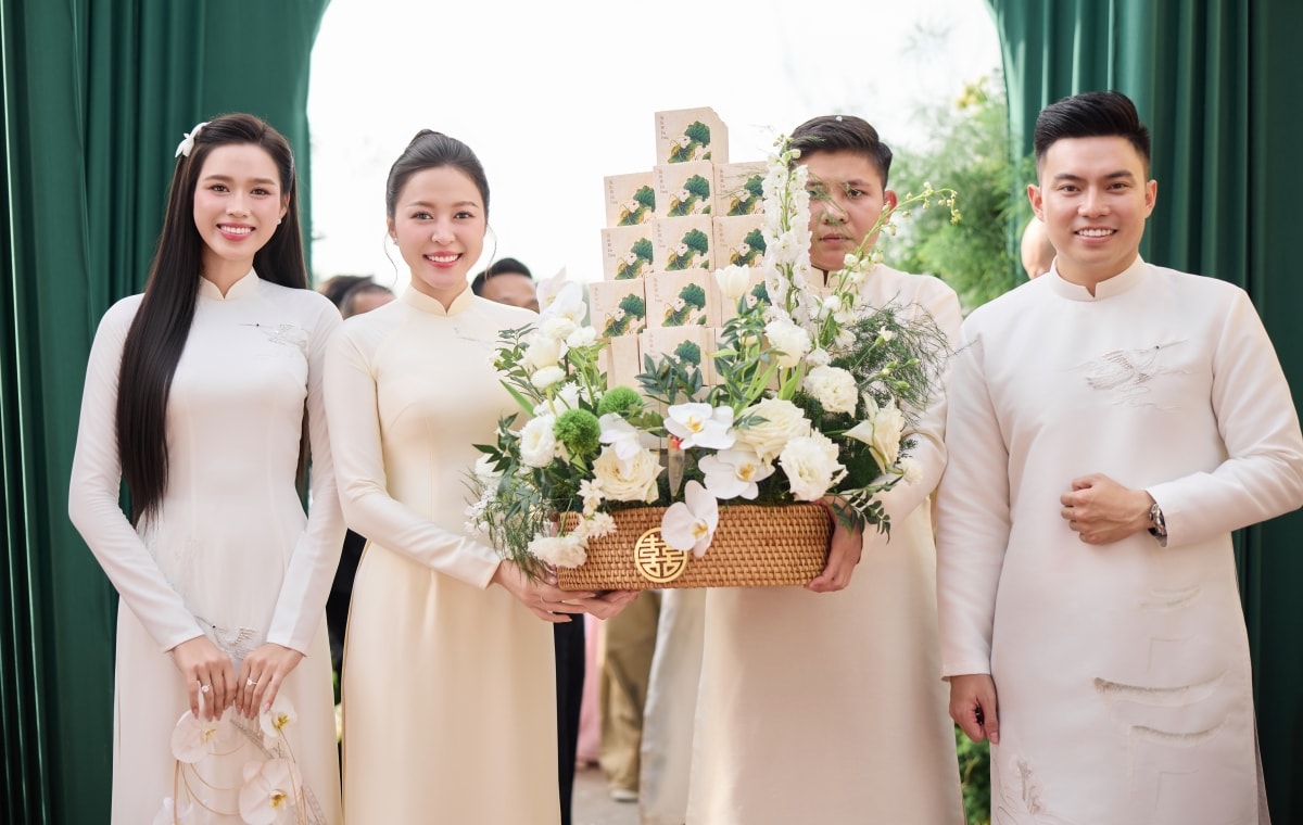 Hoa hậu Kiều Duy (thứ hai từ trái sang) làm phù dâu, nhận sính lễ, đón tiếp nhà trai.
