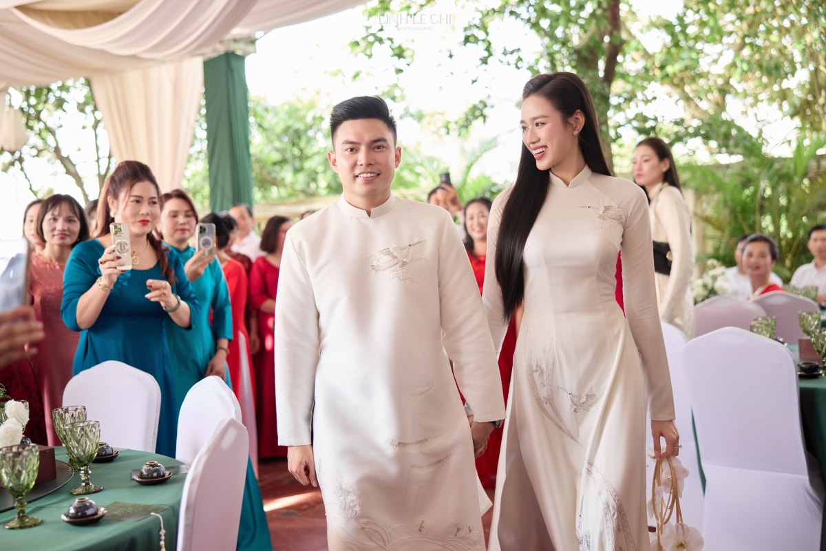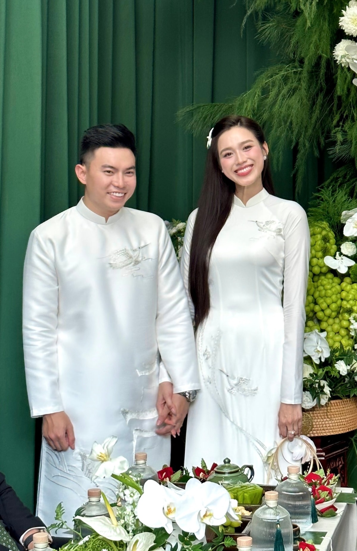 Đỗ Thị Hà và chồng diện áo dài đồng điệu. Chồng của hoa hậu quê Quảng Trị, là Tổng giám đốc Tập đoàn Sơn Hải.