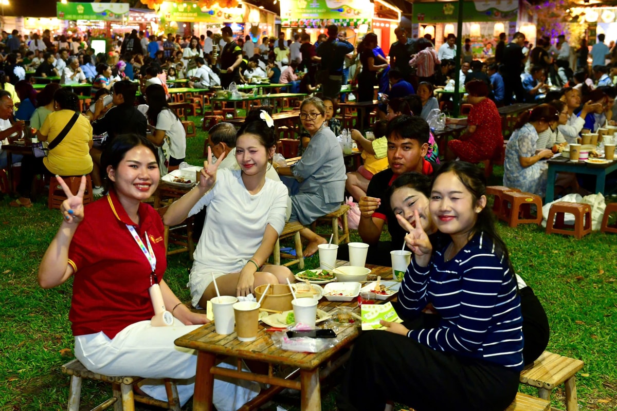 Đến tối, lễ hội càng thêm đông đúc, nhiều du khách quốc tế như nhóm của bạn Thủy Tiên (áo trắng, Lào) đến TP HCM vui chơi và học tập. Tiên cho biết rất thích thú khi được nếm thử không chỉ ẩm thực nước họ mà còn cả các món ngon ba miền Bắc – Trung – Nam. "Đây là trải nghiệm đáng nhớ nhất trong hai năm tôi học tại Việt Nam. Năm ngoái tôi và các bạn đã rất ấn tượng, thích thú nên năm nay lại đi tiếp", Tiên nói.