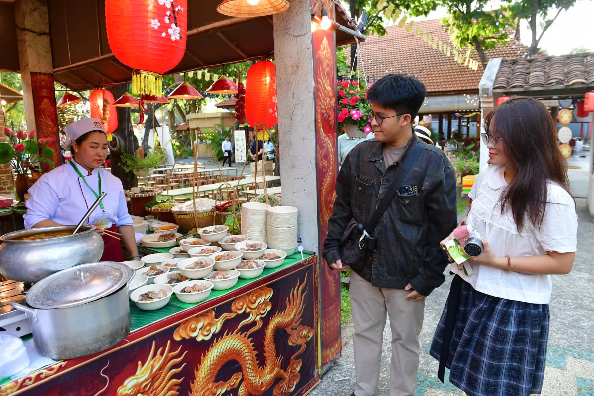 Nhiều bạn trẻ cũng ghé lễ hội từ sớm dù là ngày trong tuần. Bảo Trân (23 tuổi, phường Tân Sơn Nhất) và Phú Tài (25 tuổi) rất thích Cố đô Huế nên tranh thủ đến sớm vì sợ buổi tối sẽ đông người. Cả hai đều là fan của các món bánh truyền thống như bánh nậm, bánh bèo chén... Bún bò Huế với vị ruốc đặc trưng của khách sạn Sài Gòn Morin được Trân và Tài đánh giá cao vì đúng vị bản địa, đậm đà với thịt bò mềm, thấm vị.