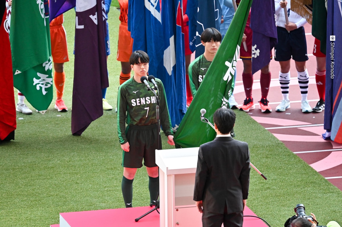 Đội trưởng Yoshiike (số 7) của trường Senshu Kitakami được chọn làm người tuyên thệ. “Tôi xin hứa thể hiện trên sân cỏ tình đoàn kết, tin tưởng vào các đồng đội, cũng như những nỗ lực mà chúng ta đã cùng nhau tích lũy và chiến đấu hết mình cho từng khoảnh khắc”, cầu thủ này nói.