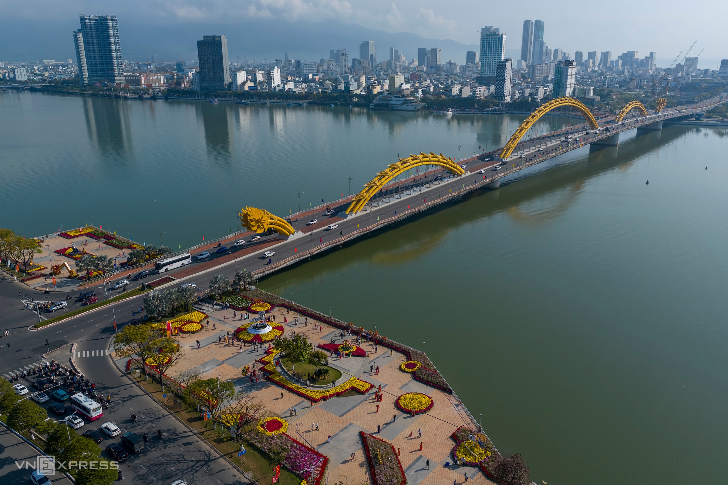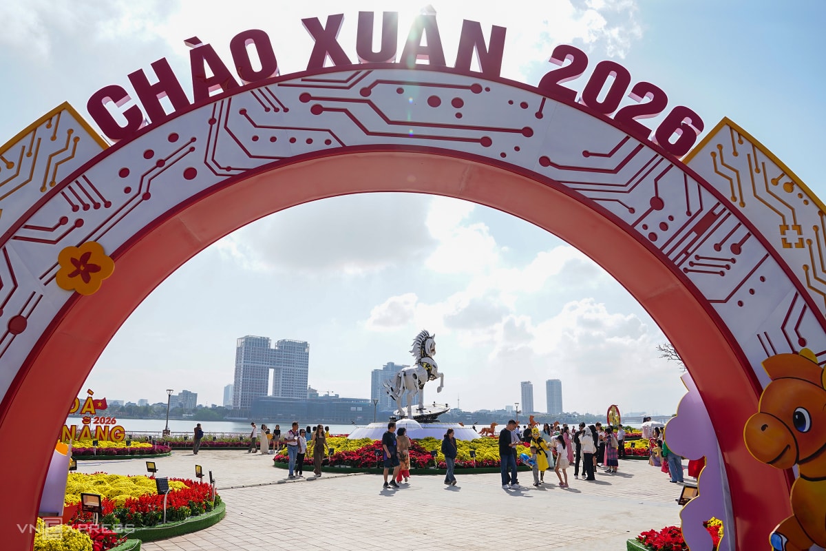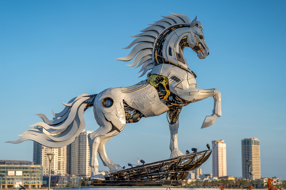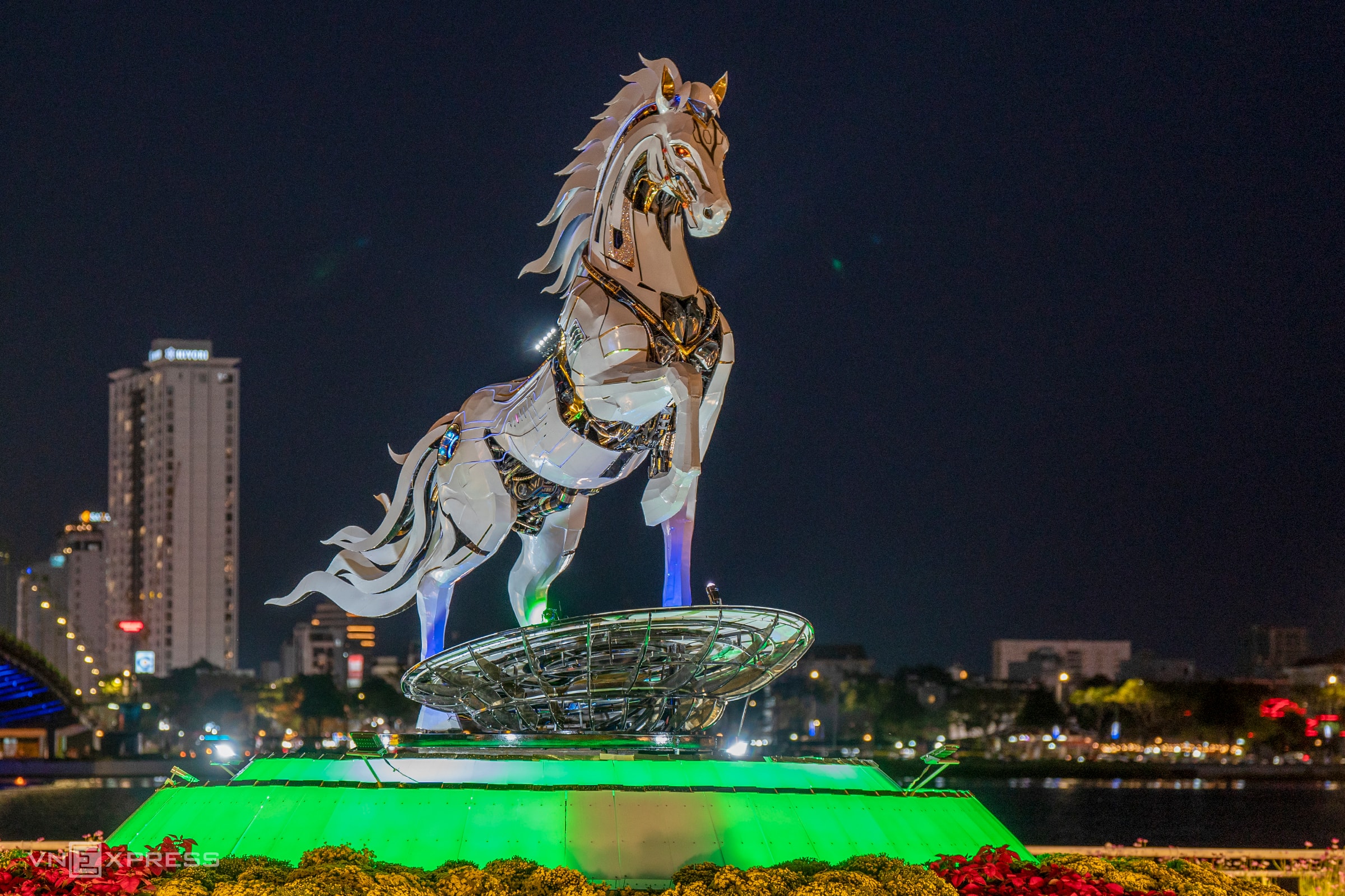 "Kim Mã 4.0" tại đuôi cầu Rồng tạo hình theo phong cách đương đại, đường nét mạnh, chi tiết gợi liên tưởng công nghệ, là điểm hoa xuân ấn tượng nhất trong 14 cụm trang trí Tết tại Đà Nẵng.