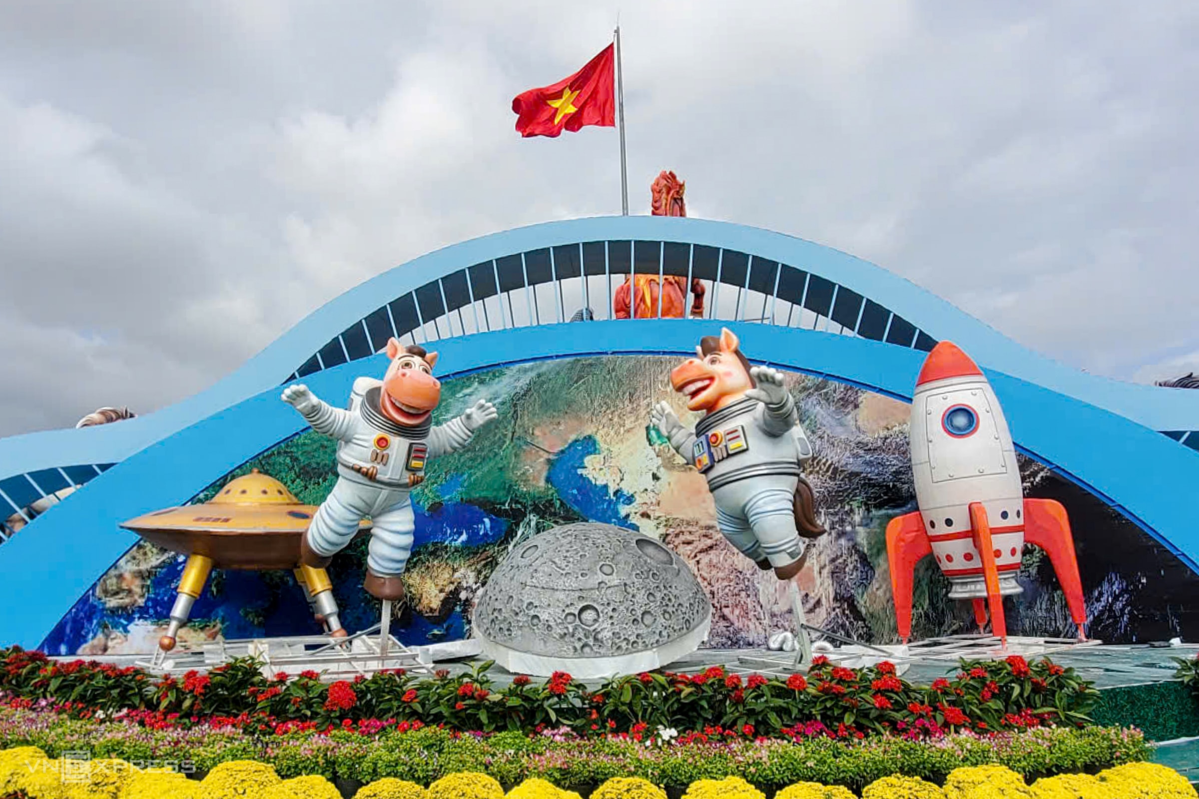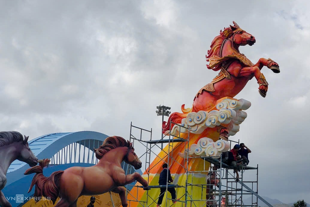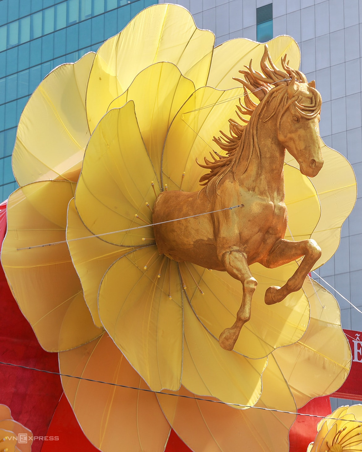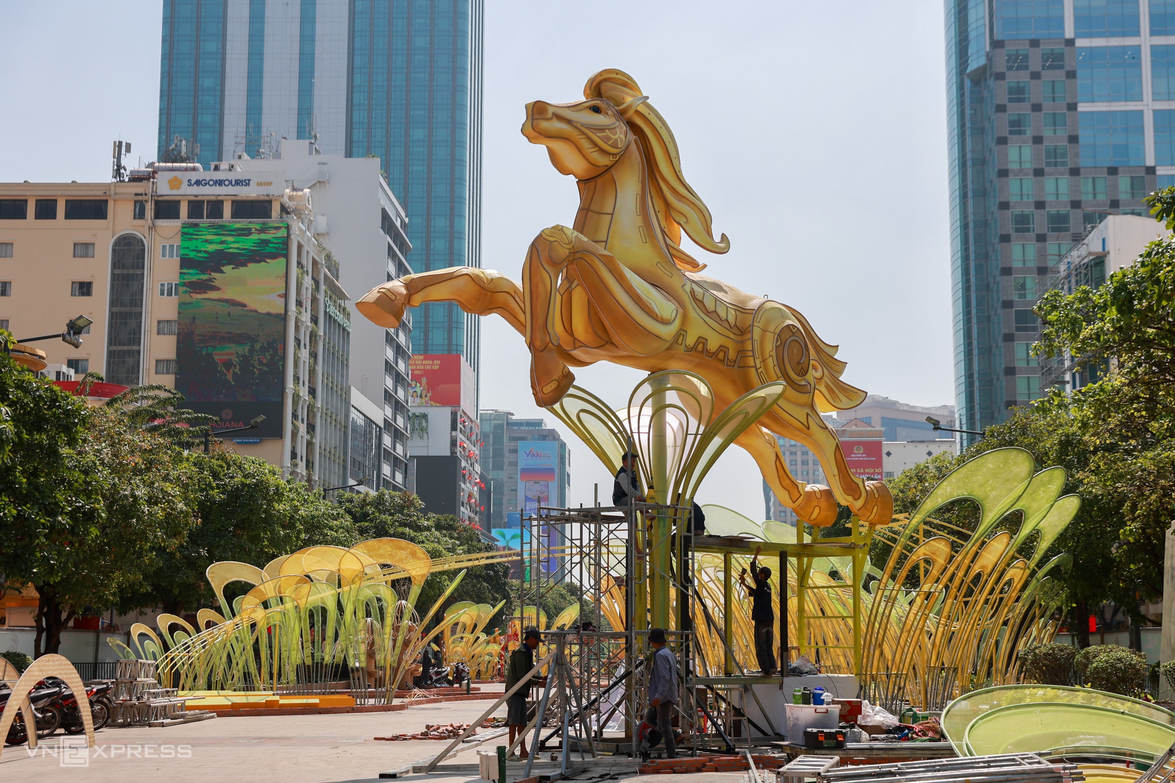 Linh vật ngựa tại cổng chính đường hoa Nguyễn Huệ (TP HCM) thi công gần hoàn thiện ngày 9/2, cao 7 m, ngang 9 m, đặt trên bệ cao 4 m, tạo hình ngựa Thánh Gióng cưỡi về trời. Mô hình làm từ mút xốp trên khung sắt thép, nặng khoảng 2 tấn, gắn motor giúp cử động đầu và chân chào đón du khách. Ảnh: Quỳnh Trần
