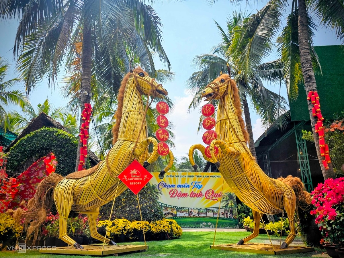 Cặp ngựa tre tại khu du lịch Lan Vương, phường An Hội, tỉnh Vĩnh Long, cao 3 m, nặng khoảng 100 kg mỗi con, tạo hình thủ công từ tre vàng; đuôi, bờm, cương tết bằng chỉ xơ dừa, tai và mắt làm từ mo, gáo dừa, mang đậm nét dân dã miệt vườn. Ảnh: Hoàng Nam
