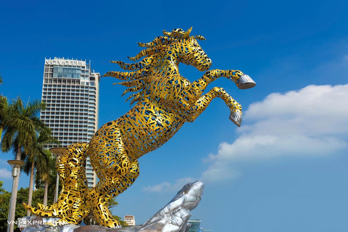 Tác phẩm "Kim Mã hợp nhất" sơn vàng, đặt trước cầu chữ T, đối diện Bảo tàng Đà Nẵng, tạo hình cao gần 4 m, thân ghép từ các khối chữ ghi tên Đà Nẵng và 94 xã, phường, đặc khu sau sắp xếp hành chính, biểu trưng cho sự hội tụ, đoàn kết và thống nhất của thành phố hôm nay. Ảnh: Nguyễn Đông
