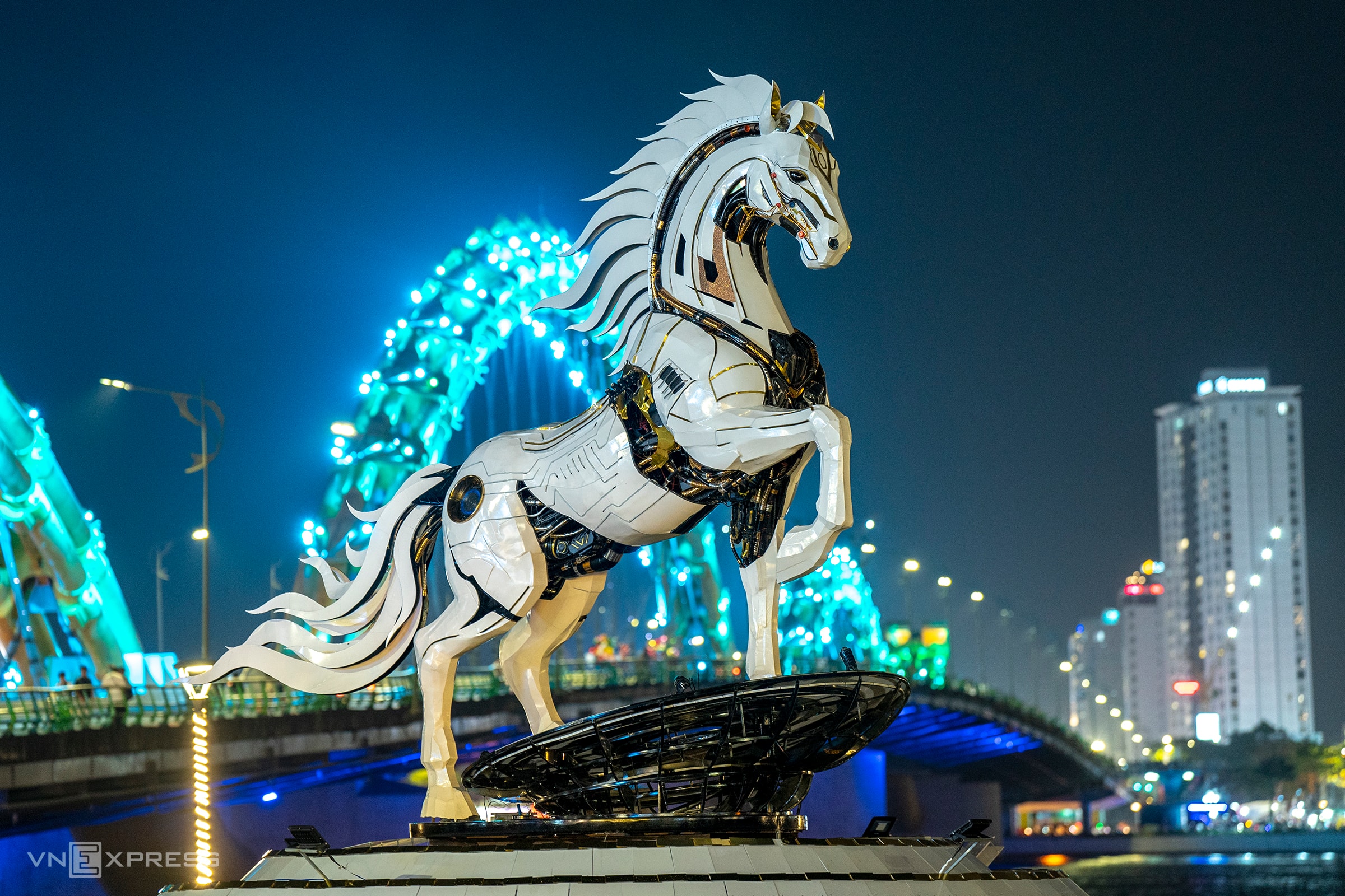 Linh vật ngựa đặt bên sông Hương, phường Phú Xuân, TP Huế, tạo hình "phi thiên" lấy cảm hứng từ Ngựa Gióng và Long Mã, biểu trưng cho khí phách, trí tuệ và khát vọng bứt phá. Hoa văn sen cách điệu trên thân nhấn mạnh nét thanh tao, cốt cách văn hóa cố đô. Ảnh: Võ Thạnh