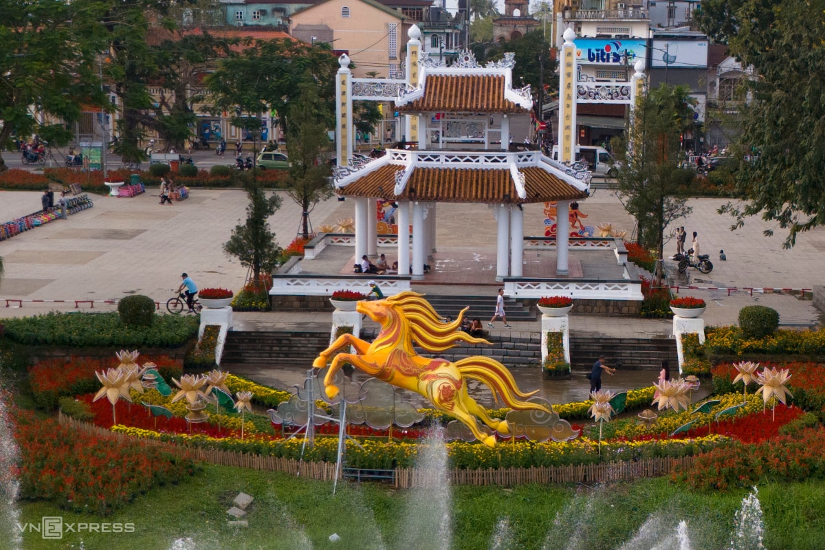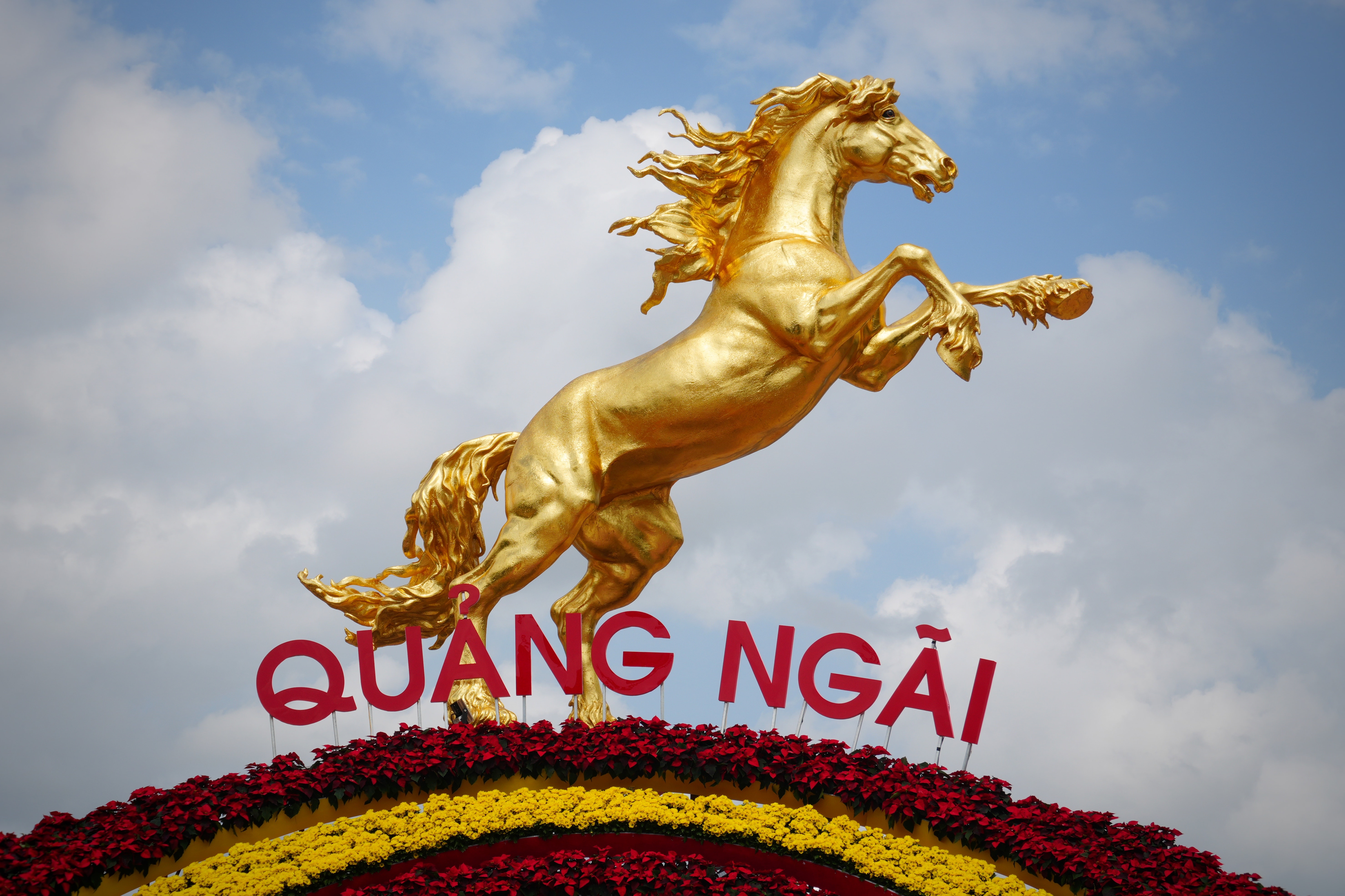 Linh vật ngựa vàng đặt tại Công viên Ba Tơ, bên bờ nam sông Trà Khúc (Quảng Ngãi), cao 6,5 m, đặt trên vòm hoa cao 4 m, được trang trí vàng lá tạo hiệu ứng lấp lánh; tác phẩm hướng ra phía Đông, biểu trưng cho khát vọng vươn ra biển lớn của địa phương. Ảnh: Phạm Linh