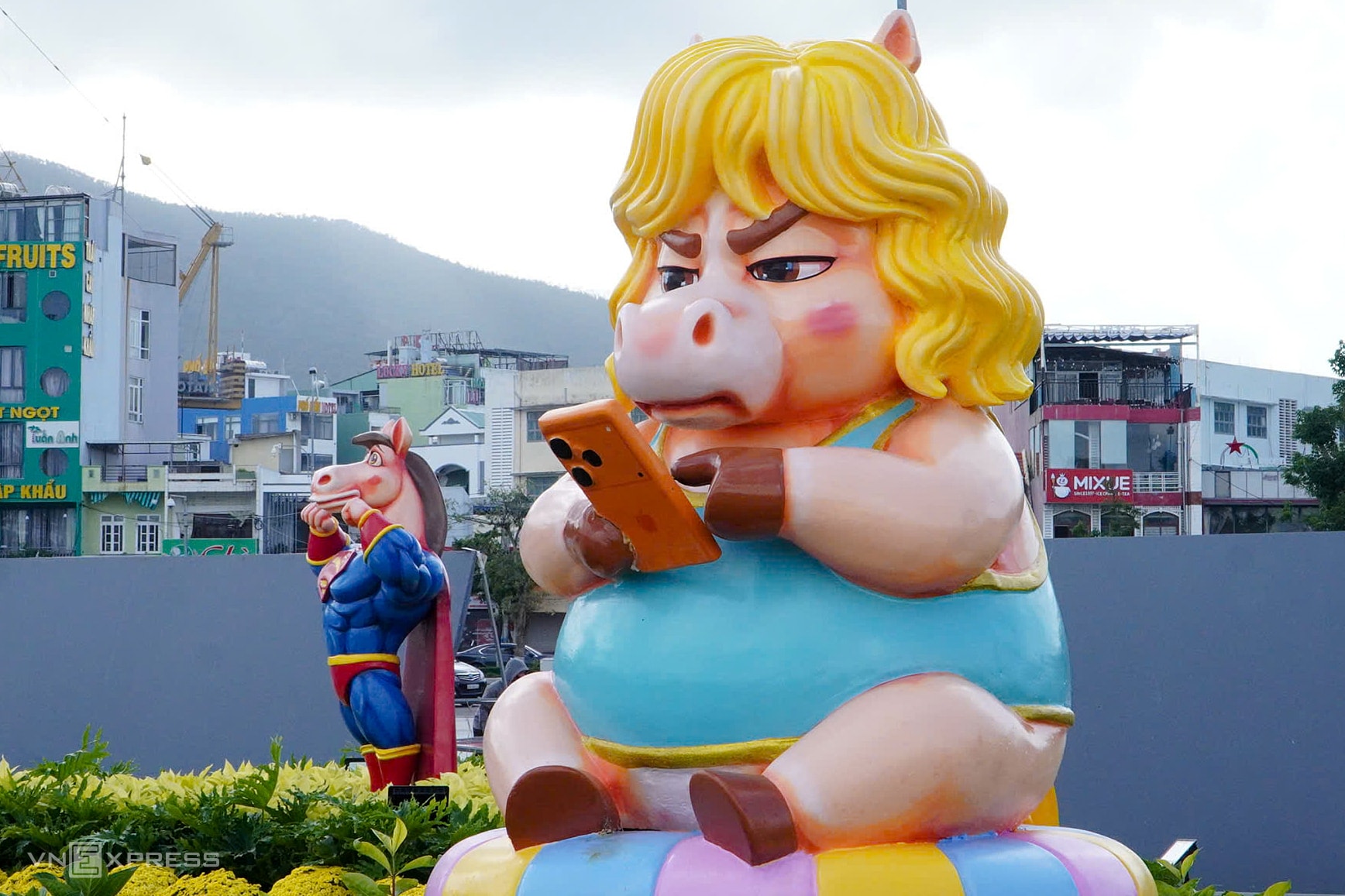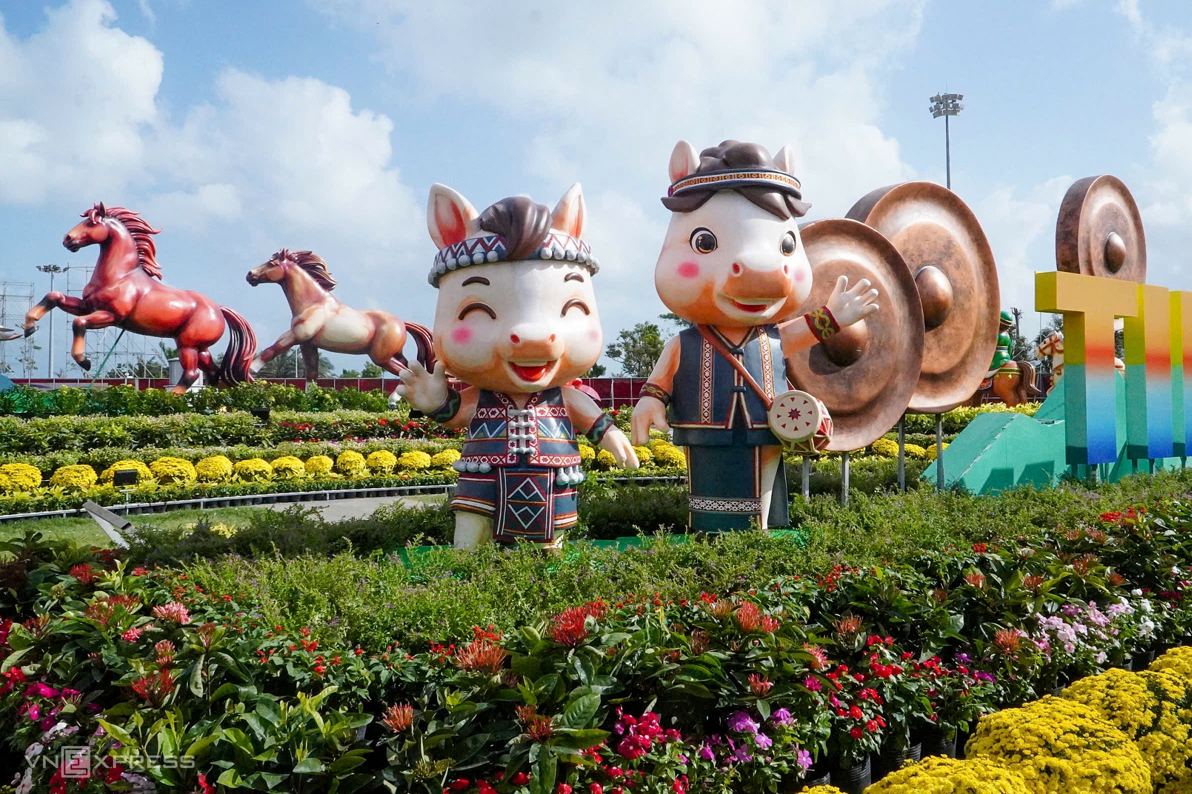 Cụm linh vật Xuân Bính Ngọ 2026 trưng bày tại quảng trường Nguyễn Tất Thành, phường Quy Nhơn, tỉnh Gia Lai, lấy cảm hứng từ miền đất võ, Tây Nguyên và núi lửa Chư Đăng Ya.