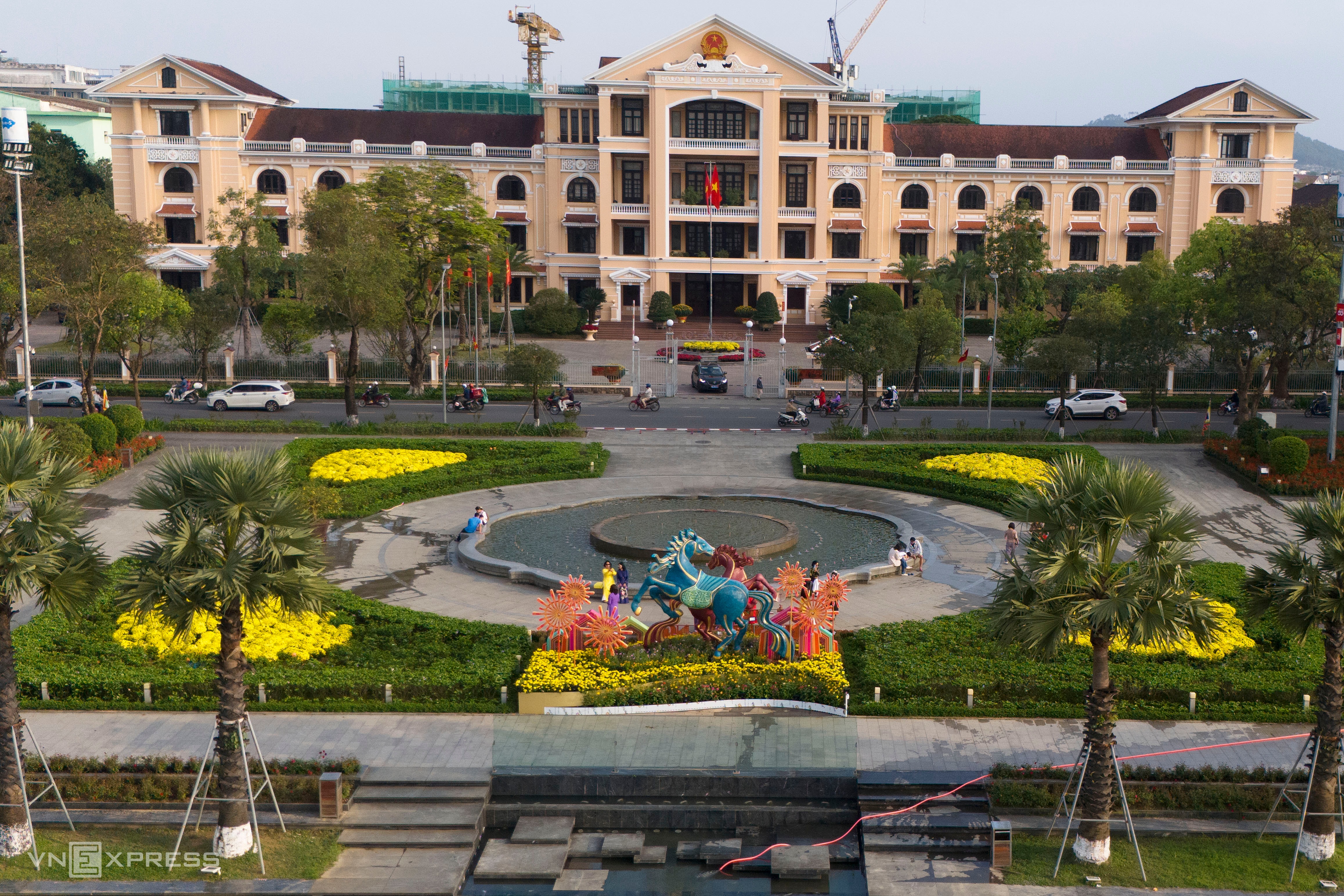 Cặp song mã đặt tại đài phun nước trước trụ sở UBND TP Huế, tạo hình theo triết lý âm dương hài hòa, hai ngựa đối lập nhưng hướng về nhau, biểu trưng cho cân bằng, thịnh trị và khởi vận. Thế phi lên mạnh mẽ tạo trục nhìn vươn cao, thu hút từ nhiều hướng. Ảnh: Võ Thạnh