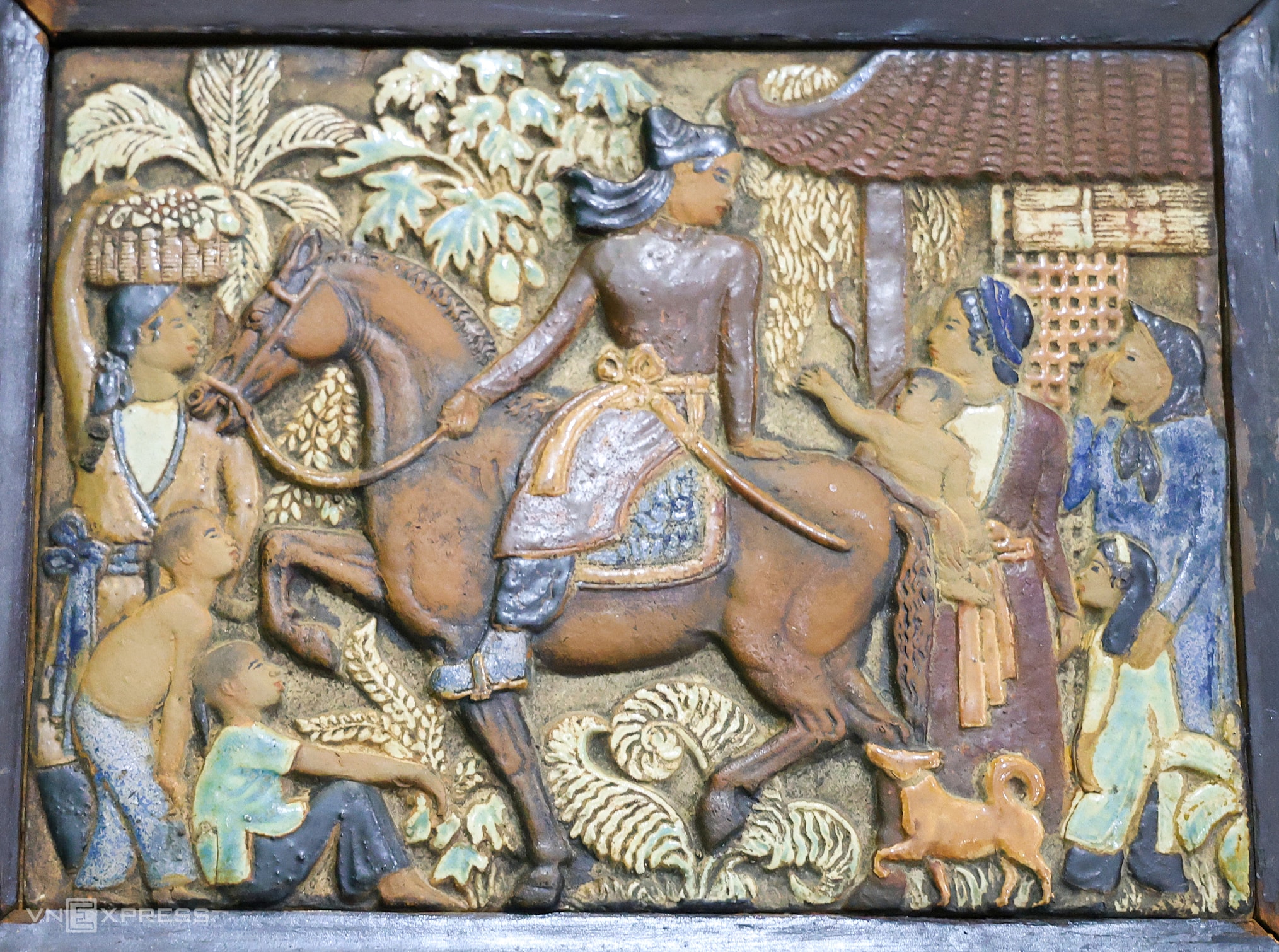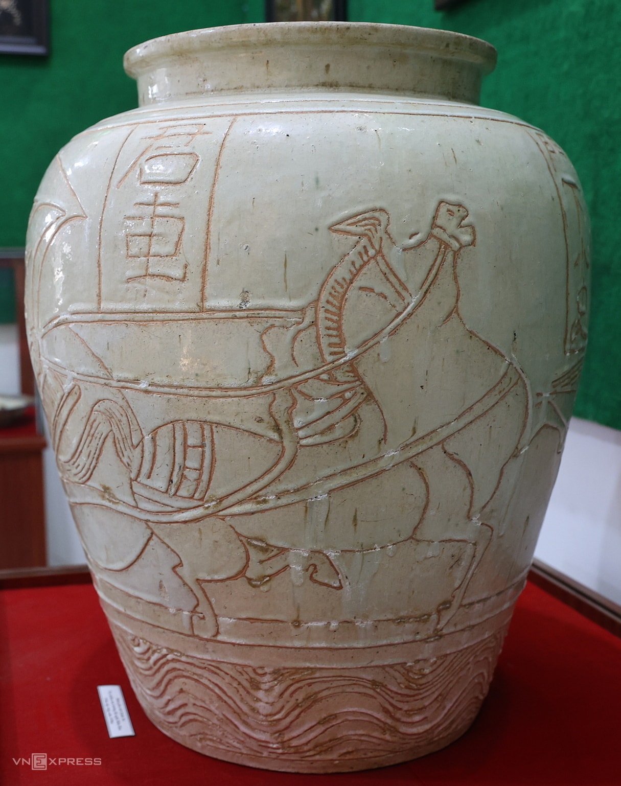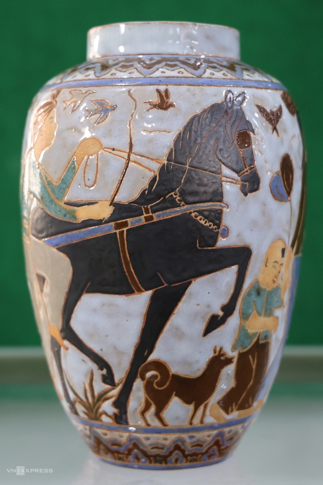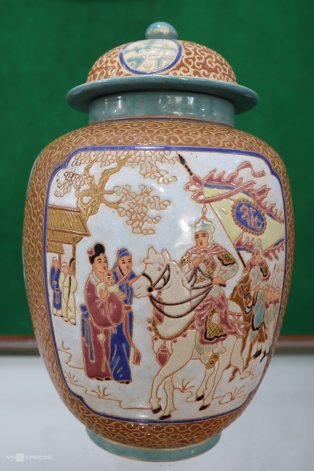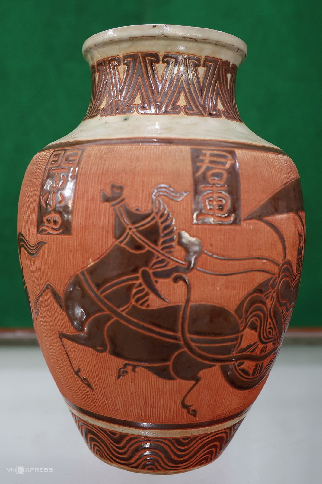Bình gốm được khắc họa với tích "Quân xa" và "Tướng quân ra trận" của Trường Bá nghệ Biên Hòa thập niên 1960.