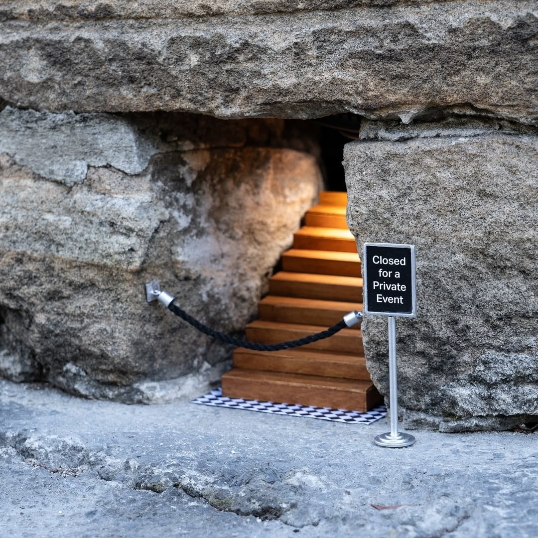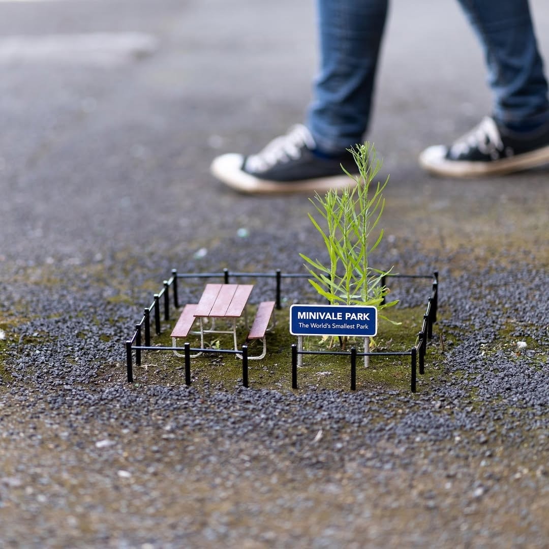 Nghệ sĩ sắp đặt Michael Pederson dựng không gian thảm đỏ từ một khe đá nhỏ, công viên mini trên mảng rêu ở mặt đường.