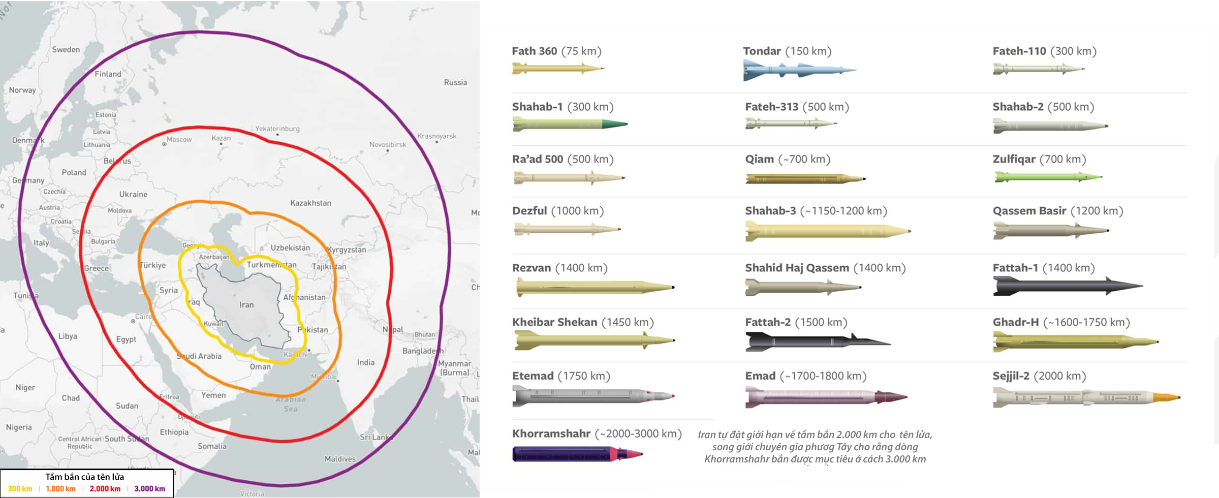 Iran sở hữu kho tên lửa với tầm bắn hàng nghìn km, được ông Trump mô tả là đủ sức đe dọa châu Âu và căn cứ Mỹ ở Trung Đông.