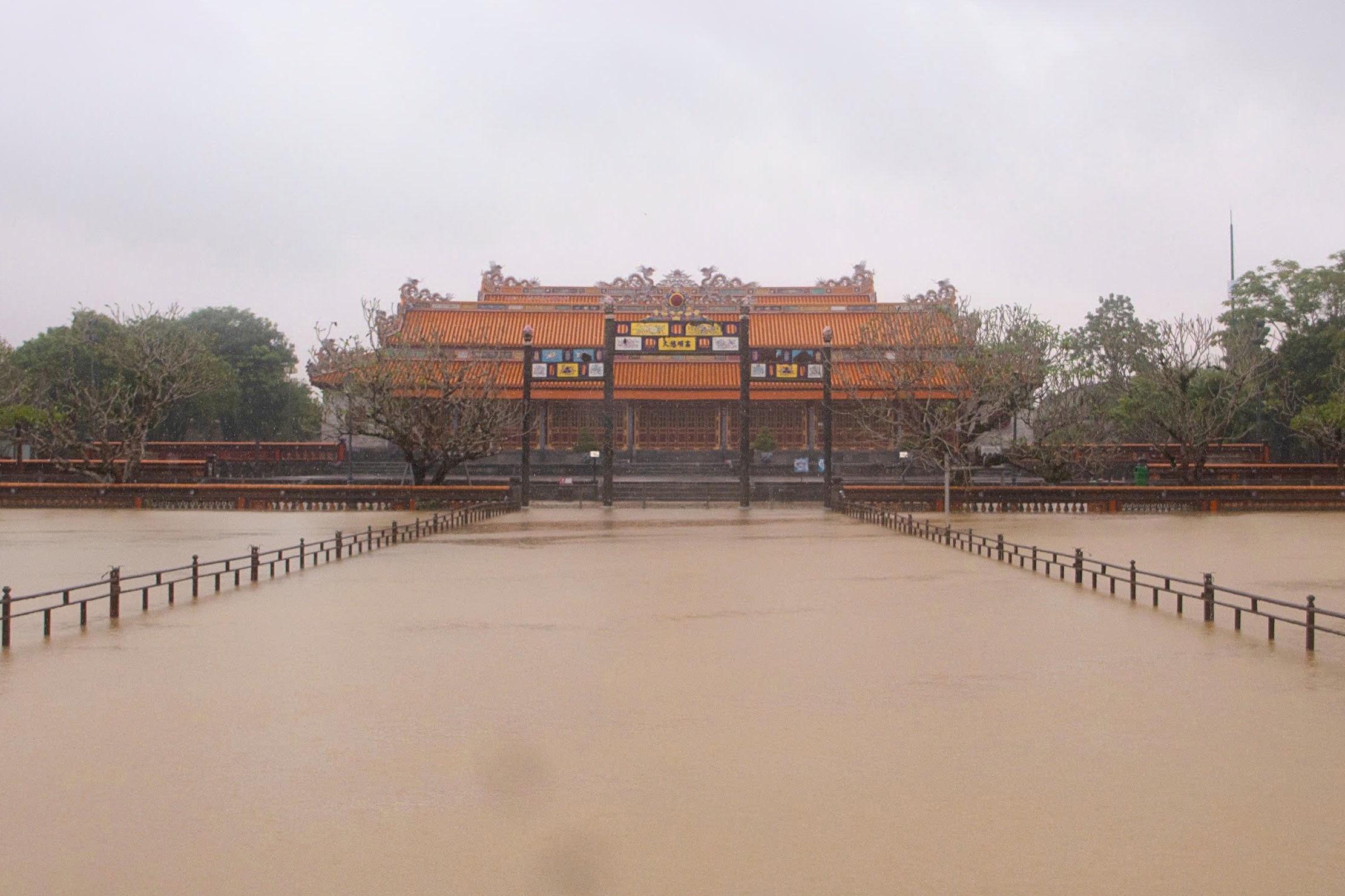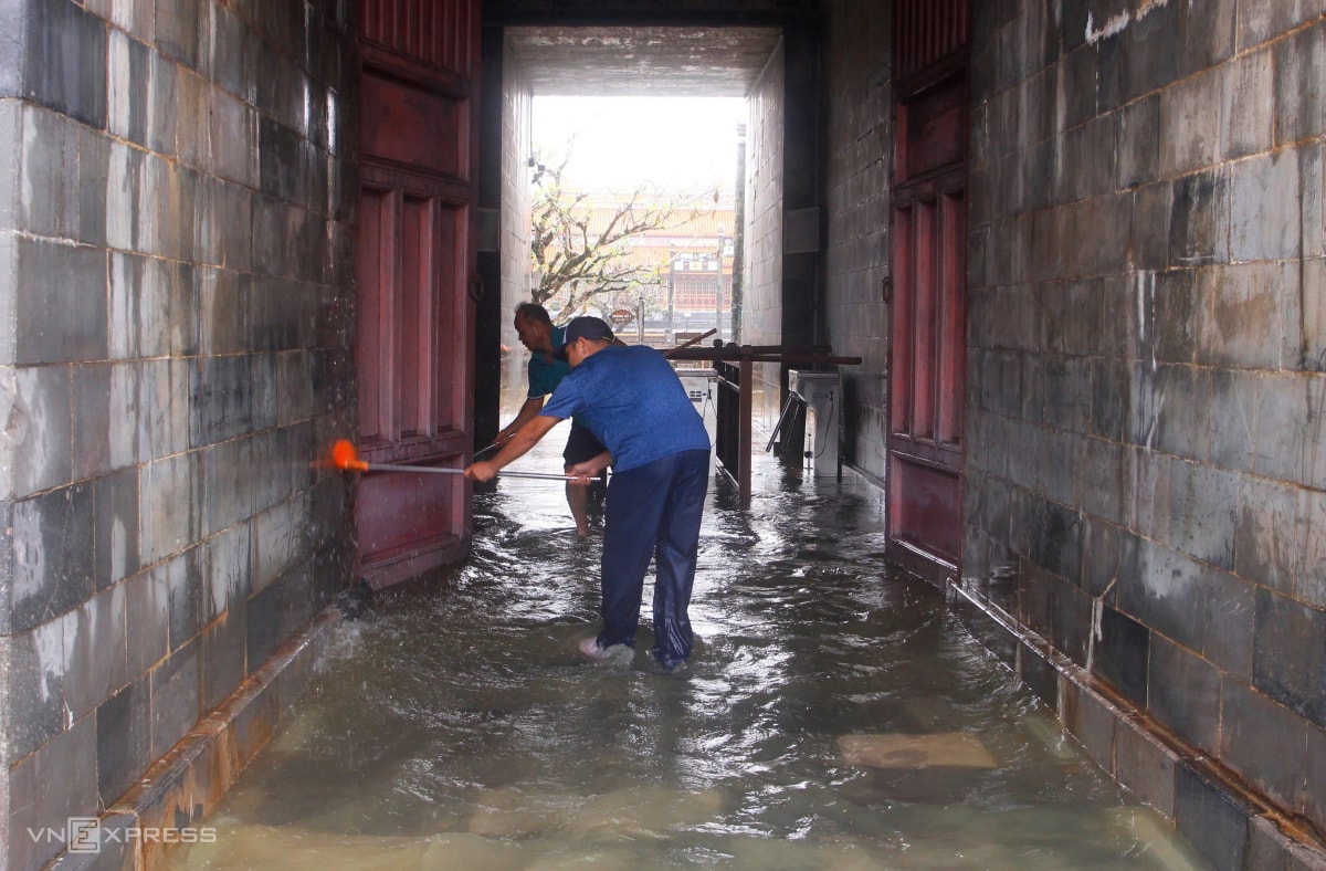 Sáng nay, lũ sông Hương, sông Bồ rút hơn một mét so với lúc đỉnh, song Đại nội Huế vẫn bị nước bao vây tứ bề, khuôn viên ngập 0,5-1 m.