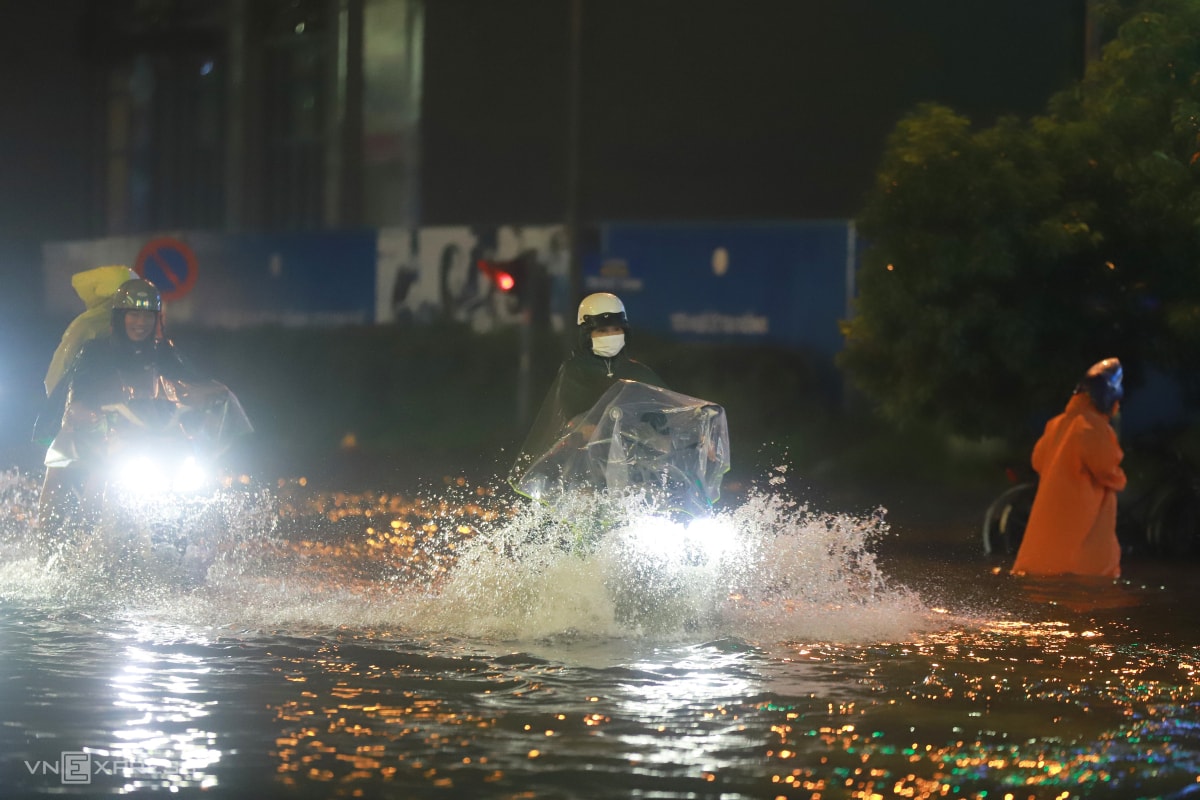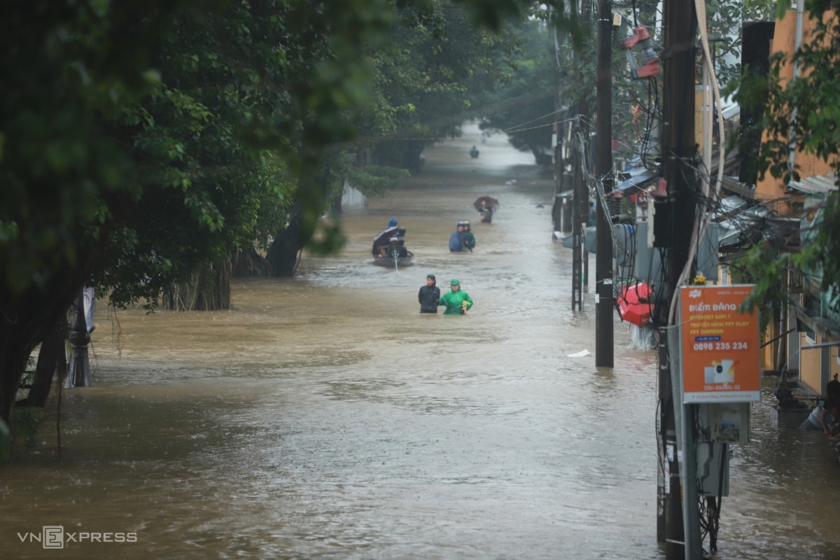 Đường Nguyễn Chí Thanh đoạn qua phường Thuận Hóa ngập sâu hơn 1m. Người dân muốn di chuyển phải đi thuyền hoặc lội nước.