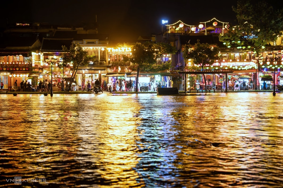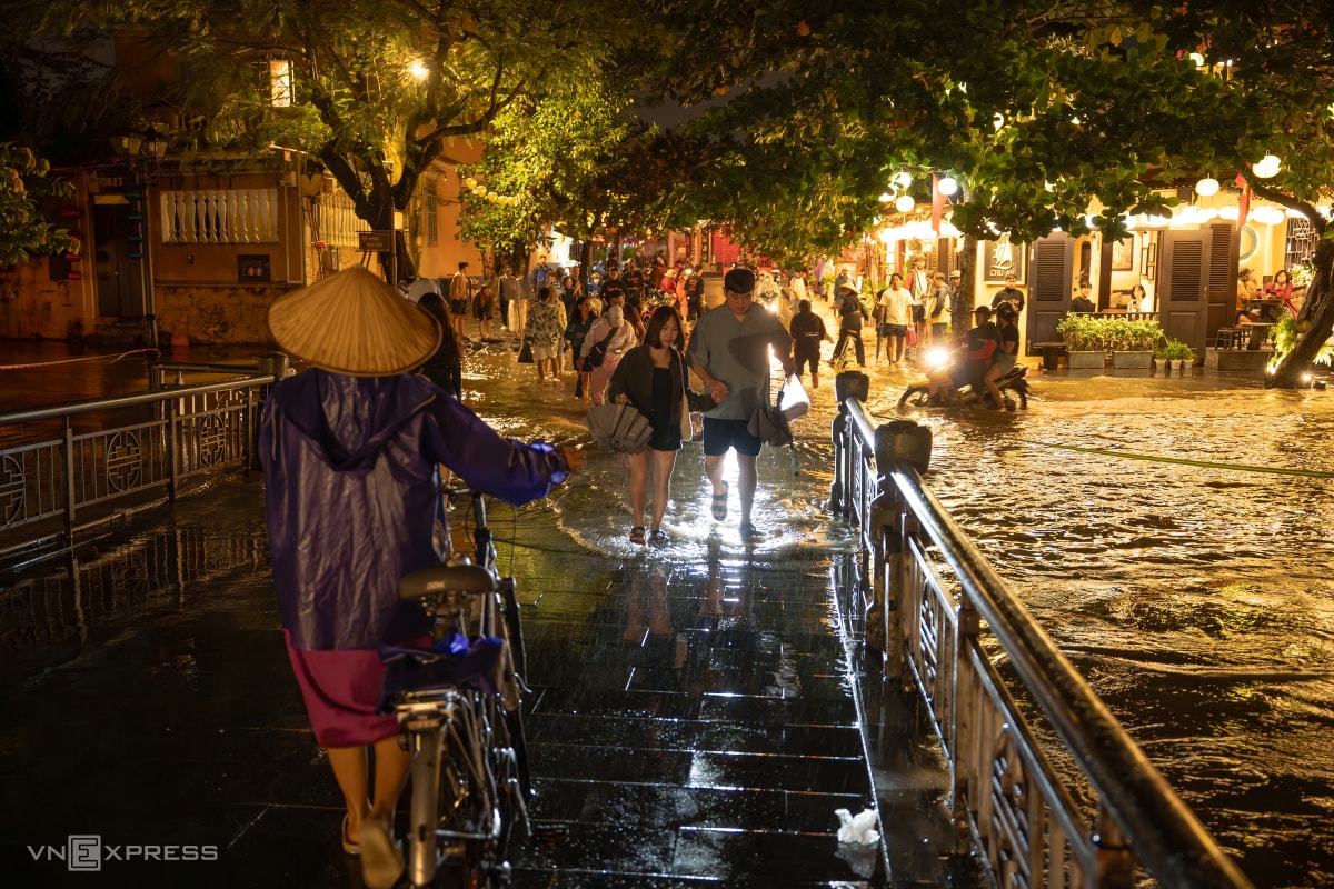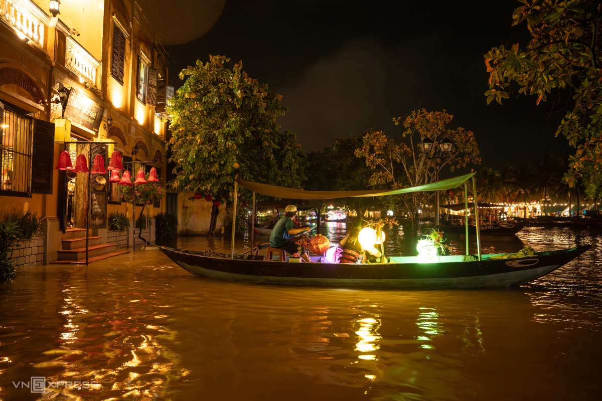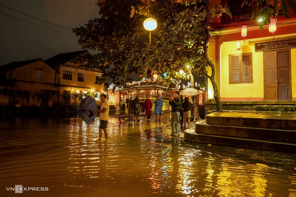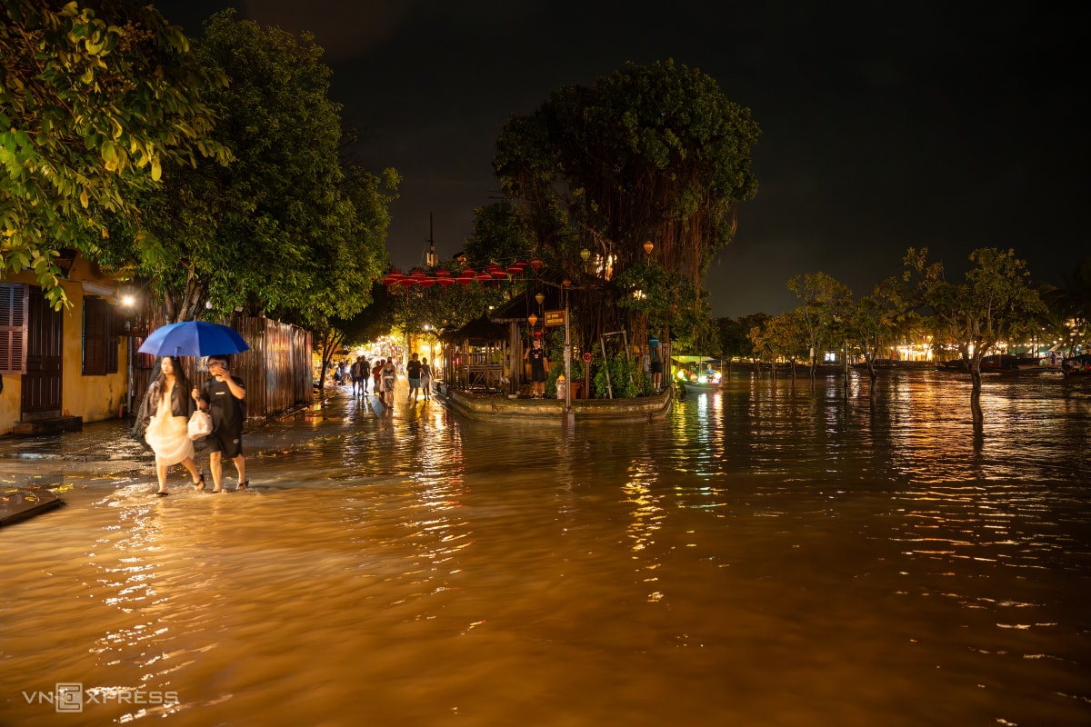 Càng về khuya, nước sông Hoài càng dâng cao, tràn vào phố cổ Hội An, chỗ sâu nhất khoảng một mét, du khách lội nước ngắm phố trong đêm mưa lũ.