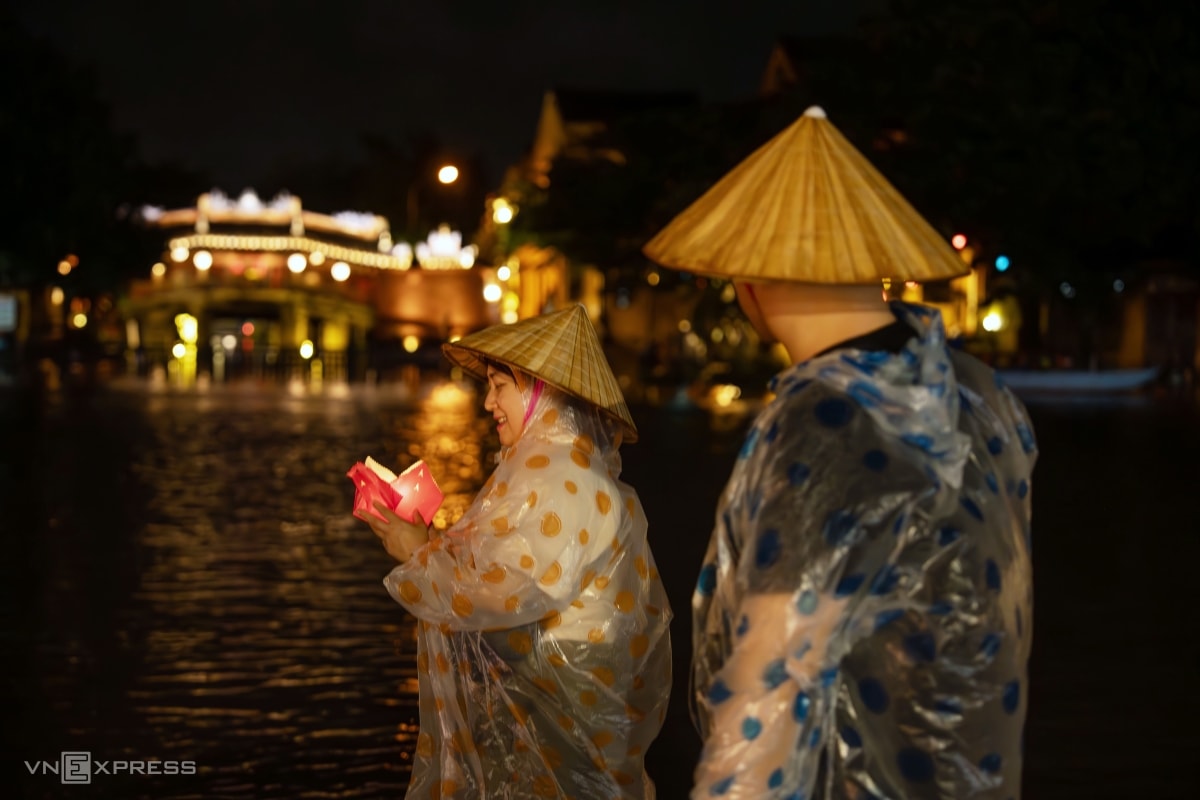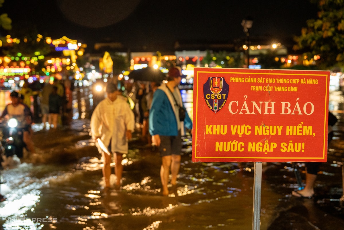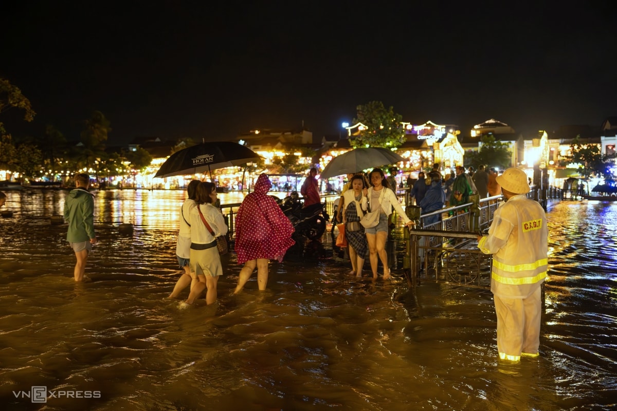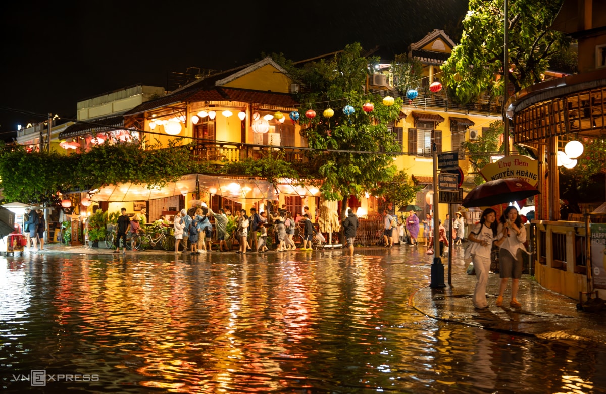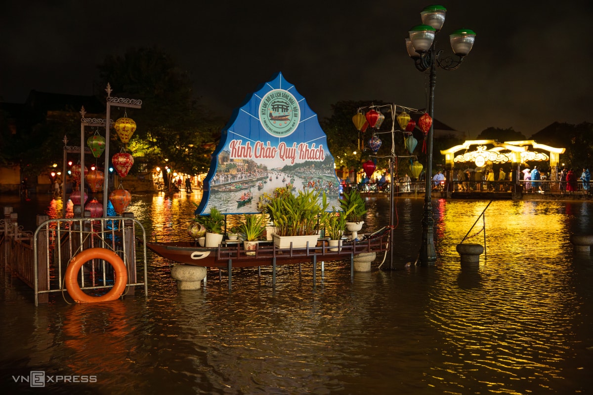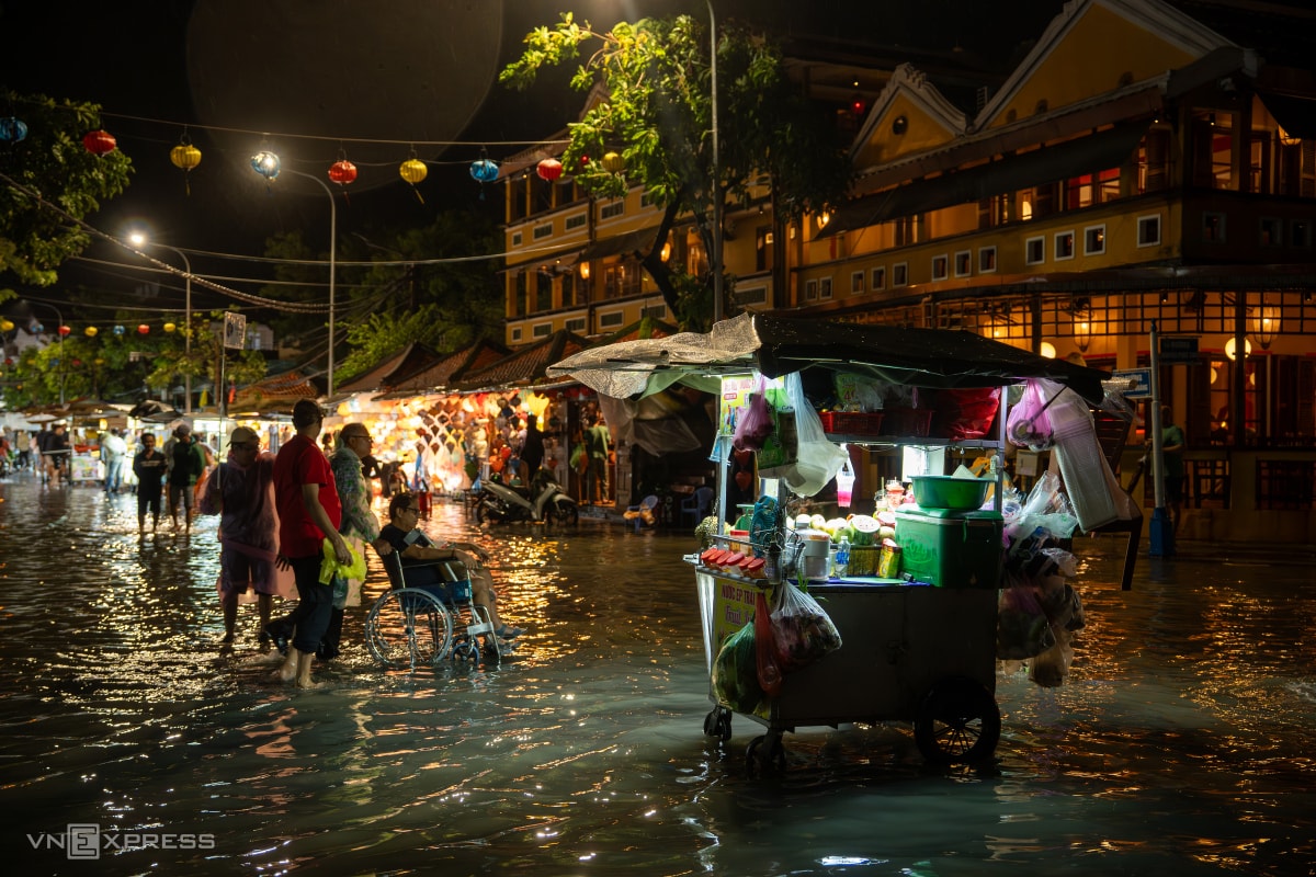 Càng về khuya, nước sông Hoài càng dâng cao, tràn vào phố cổ Hội An, chỗ sâu nhất khoảng một mét, du khách lội nước ngắm phố trong đêm mưa lũ.