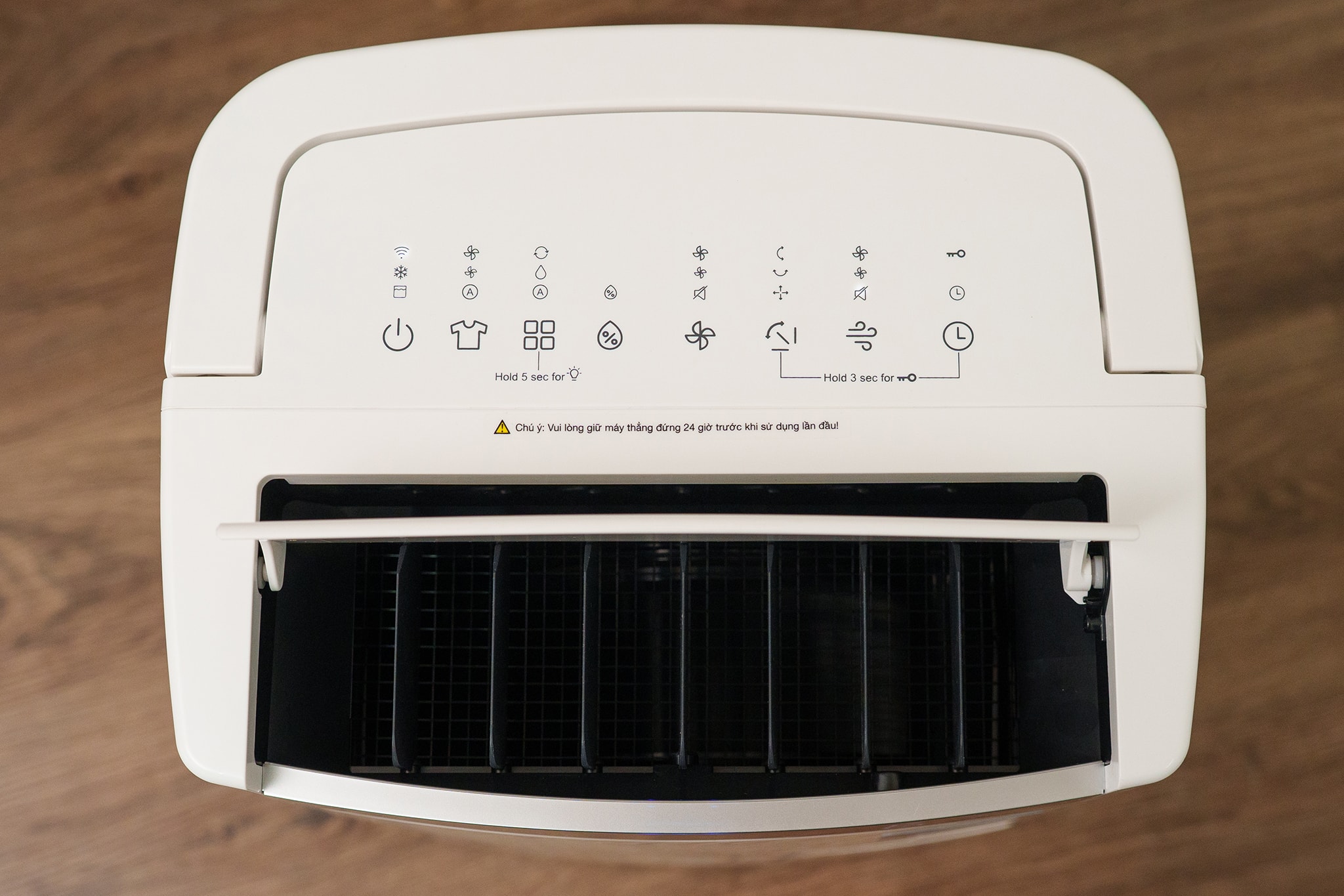 Thiết kế chữ nhật giúp để gọn hơn vào góc tường cùng hệ thống cánh đảo gió phía trên giúp không khí tuần hoàn tốt hơn. Màn hình LED hiển thị thông số độ ẩm được đưa ra cạnh trước máy.