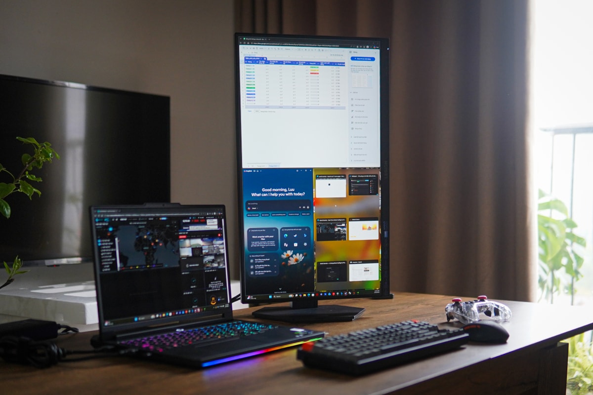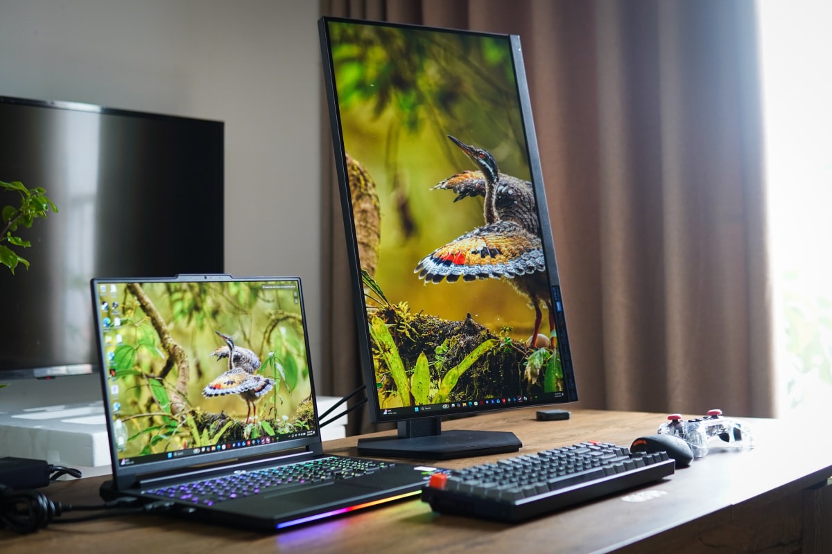 Một trong những điểm cộng của màn hình là có thể thiết lập theo kiểu nằm ngang hoặc thẳng đứng, giúp phù hợp với đa dạng nhu cầu của người dùng. Màn sử dụng tấm nền công nghệ IPS với độ phân giải QHD (2.560 x 1.440 pixel), cho khả năng tái tạo màu sắc ổn định, cùng lớp phủ chống lóa. Độ phủ màu đạt 99% sRGB và 90% DCI-P3, thiết bị đáp ứng tốt nhu cầu giải trí và các công việc đồ họa cơ bản.