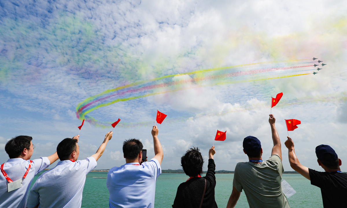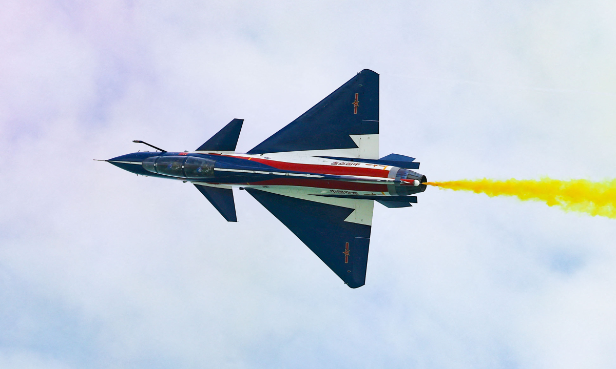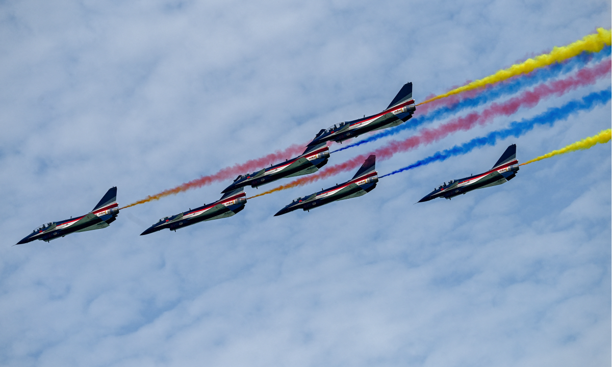 Đội bay Bát Nhất của Trung Quốc biểu diễn với 6 tiêm kích hạng nhẹ J-10C trên bầu trời Trung tâm Triển lãm Changi. Ngoài các màn xếp đội hình và xả khói màu trên không, hai phi cơ cũng thực hiện nhiều động tác nhào lộn đơn.