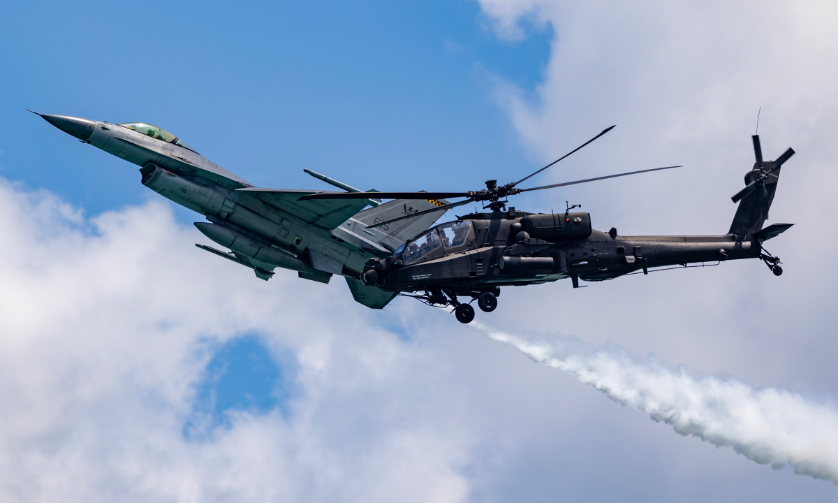 Tiêm kích F-16C và trực thăng AH-64D Apache của không quân Singapore trình diễn tại triển lãm.