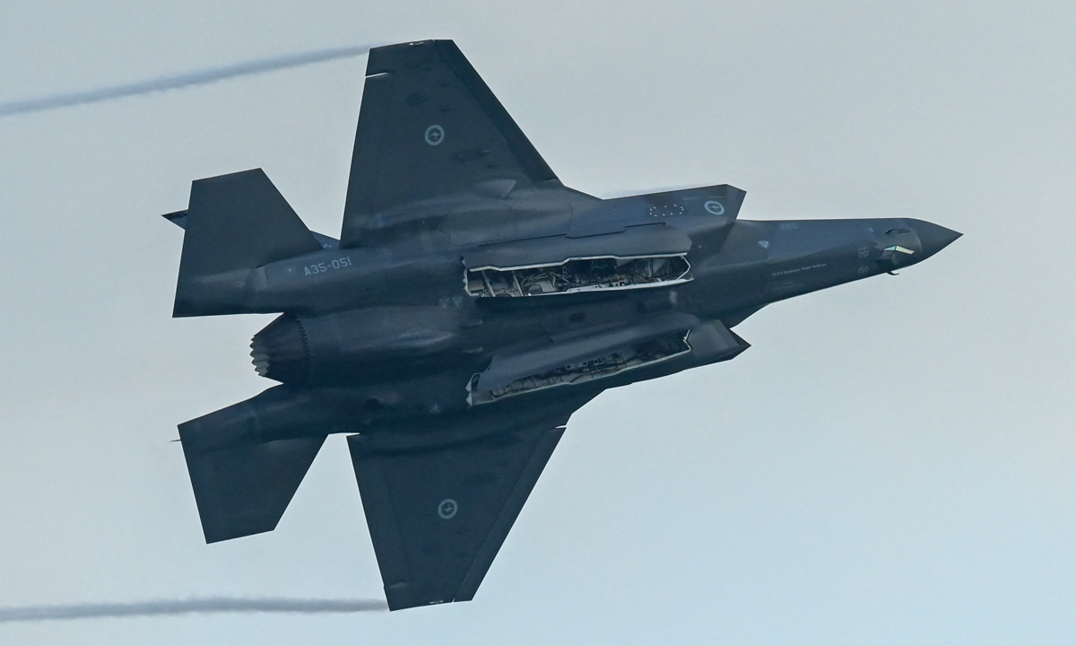 Tiêm kích F-35A của không quân Australia bay qua khán đài trong trạng thái mở cửa khoang vũ khí trong thân.