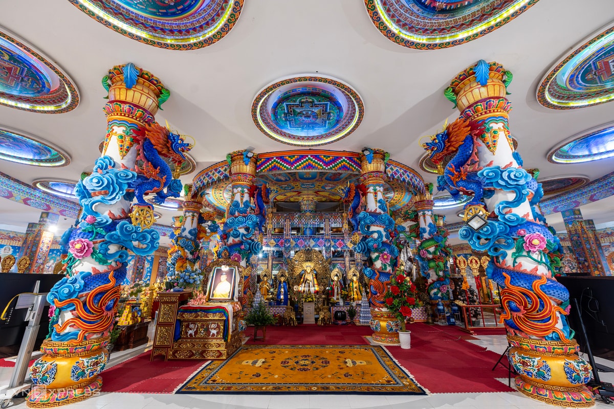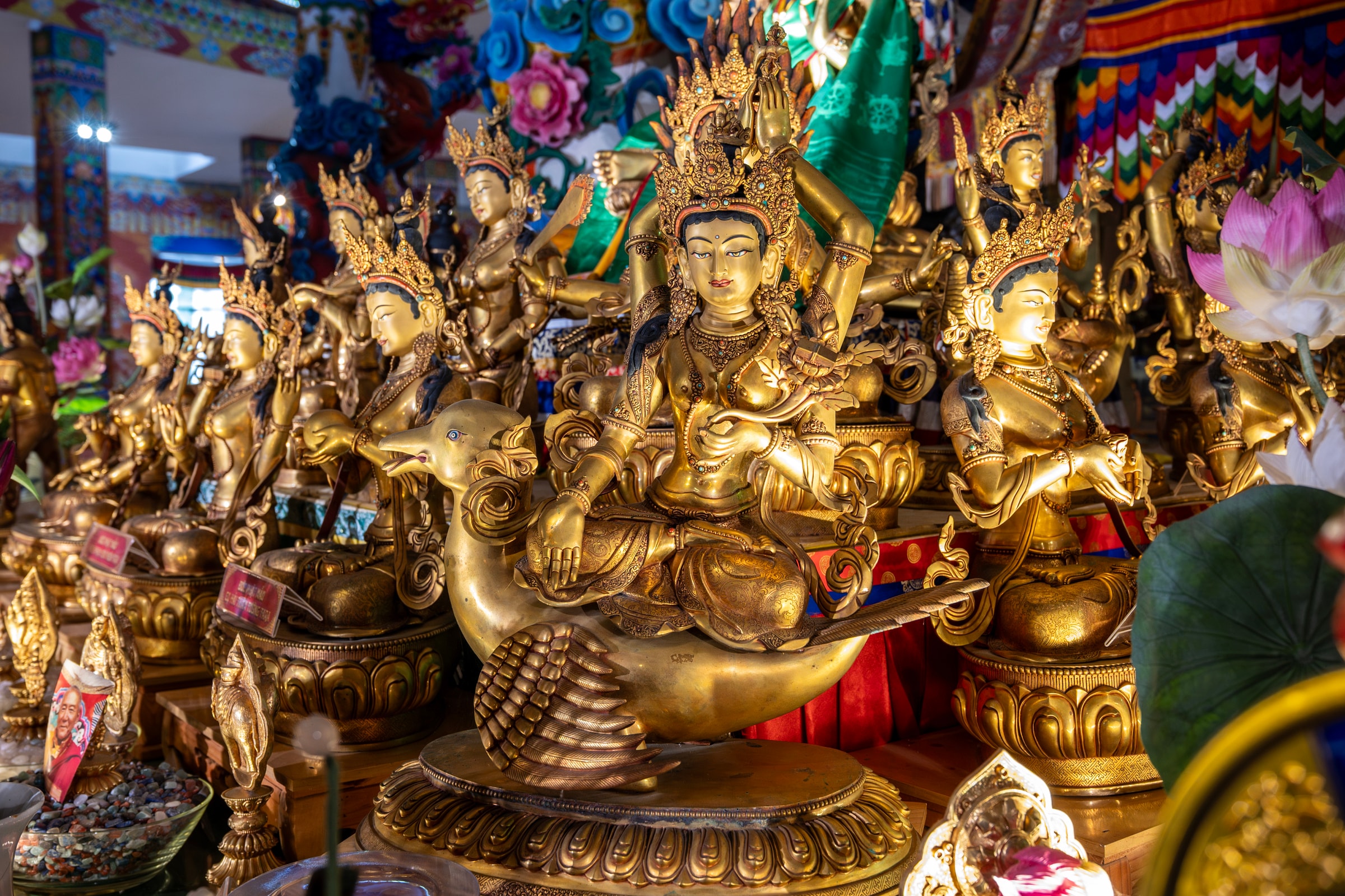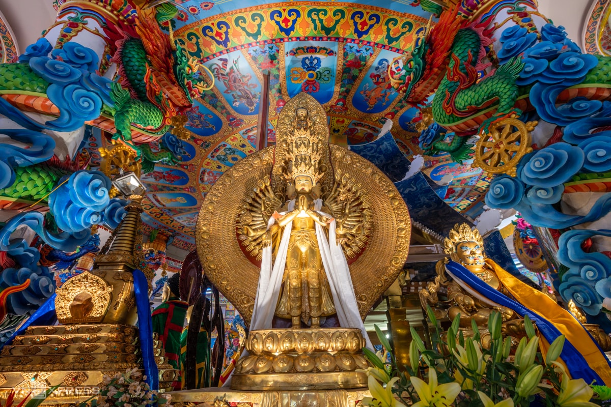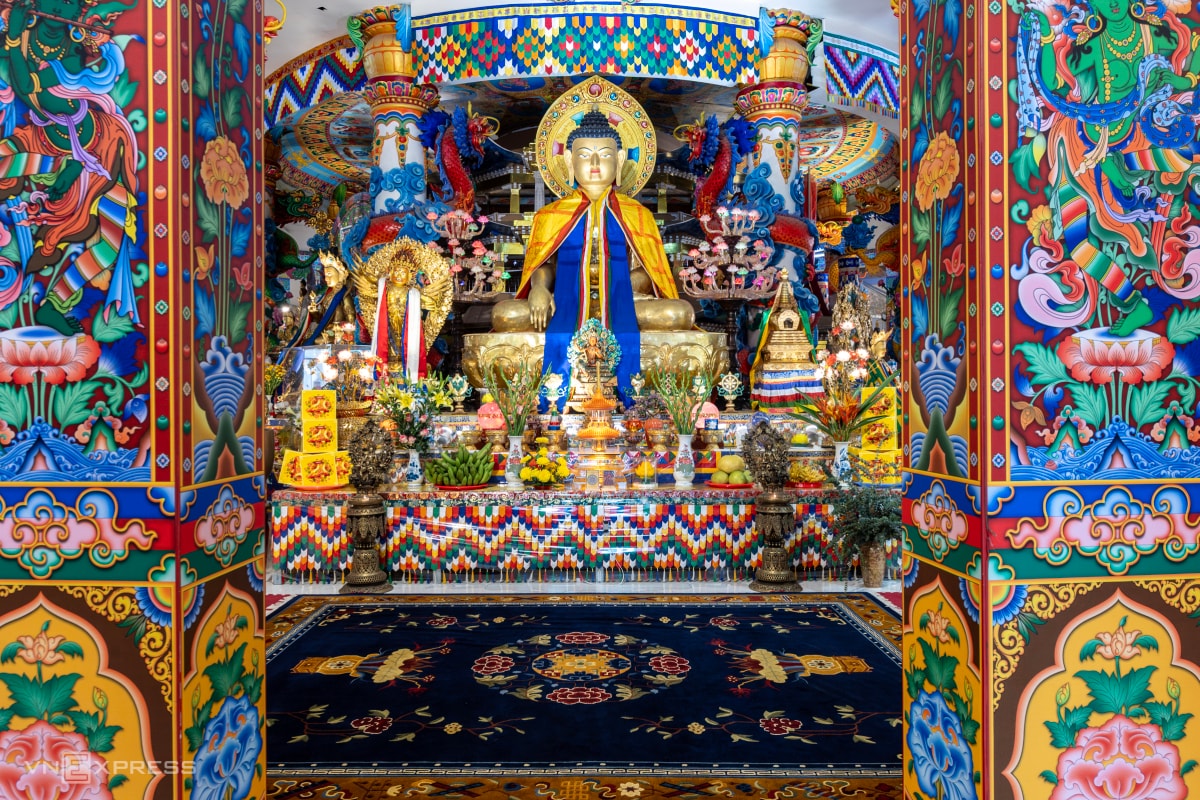 Chính điện được bài trí và định hình thành không gian trải nghiệm (di chuyển theo chiều kim đồng hồ) giúp người dân "đọc" kiến trúc lẫn triết lý Phật giáo Kim cương thừa. Bốn hướng thờ các chư Phật khác nhau đại diện cho nhiều phương diện trong đời sống chúng sinh. Con người gặp vấn đề gì thì có thể tìm đến vị Phật bảo hộ cho khía cạnh ấy để chiêm bái và thực hành tu tập.