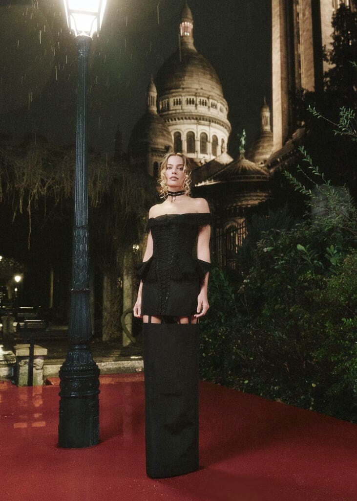 Ở buổi chiếu tại Paris hôm 2/2, Margot Robbie diện trang phục Thom Browne được thiết kế riêng. Theo Vogue, bộ cánh thể hiện những dòng chảy ngầm đen tối của câu chuyện bằng cách kết hợp áo corset phá cách, phần peplum ren và chân váy yếm rời mô tả sự chia ly. Ảnh: Celebmafia