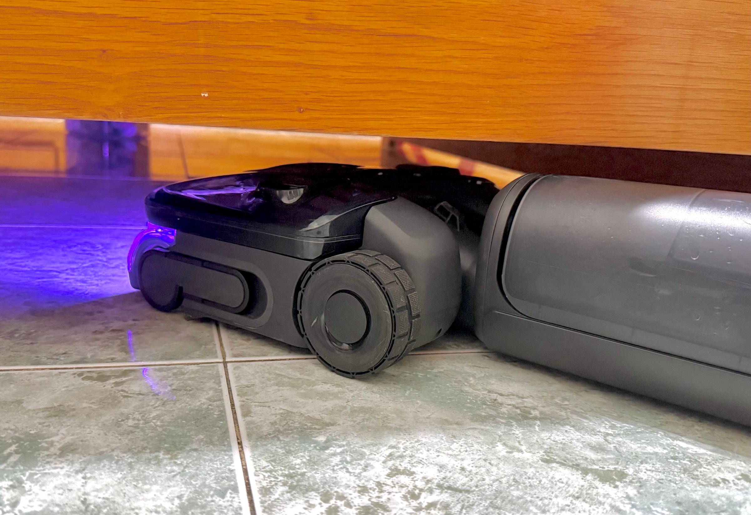 Tương tự các model lau nhà ra mắt trong năm nay, sản phẩm có thiết kế gập sát 180 độ với độ dày 12,5 cm và bánh xe nhỏ trên tay cầm để chui vào khu vực thấp như gầm giường, ghế. Bánh xe có trợ lực và sử dụng AI nhận diện hướng đẩy hay kéo và thay đổi hướng quay theo thời gian thực. Trải nghiệm thực tế, việc làm sạch nhẹ nhàng hơn các thế hệ trước. Khi cho thiết bị chui vào gầm giường, người dùng có thể điều khiển tiến lùi, hay chuyển hướng thông qua ứng dụng trên smartphone. Loa ngoài tích hợp phía sau tay cầm, hỗ trợ thông báo bằng tiếng Việt.