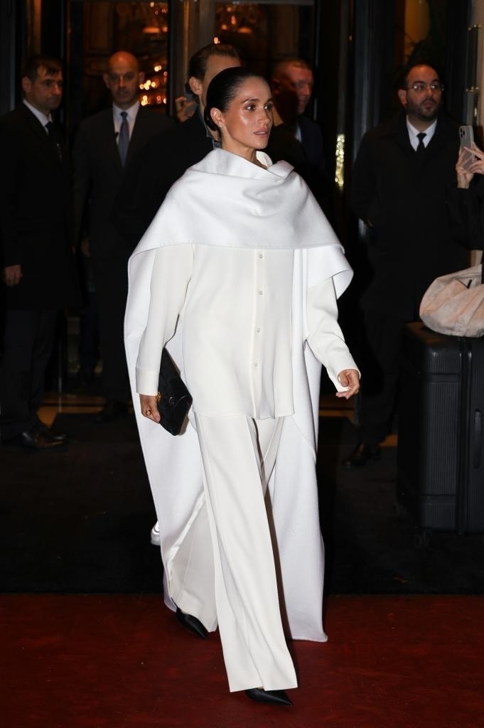 Ở buổi trình diễn bộ sưu tập Xuân Hè 2026 của Balenciaga hôm 4/10, Meghan Markle gây chú ý khi diện cả bộ quần áo lụa kèm khăn choàng trắng. Kiểu thiết kế khăn đồng điệu áo đang là xu hướng hot rộ lên từ cuối năm 2023. Ảnh: Backgrid