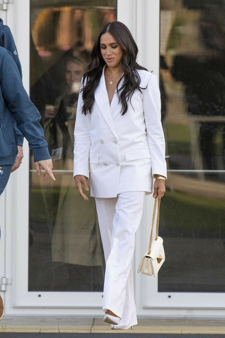 Theo Telegraph, khoảng ba năm nay, Megan Markle mặc đồ trắng nhiều hơn. Theo Vogue, vợ của Harry - Công tước xứ Sussex - thích màu trắng vì toát lên vẻ tinh khôi, trang nhã, điềm tĩnh, truyền tải thông điệp về thời trang cao cấp. Cô ưu tiên các thiết kế màu này mang phong cách tối giản, xử lý chất liệu thân thiện môi trường. Ảnh: Backgrid