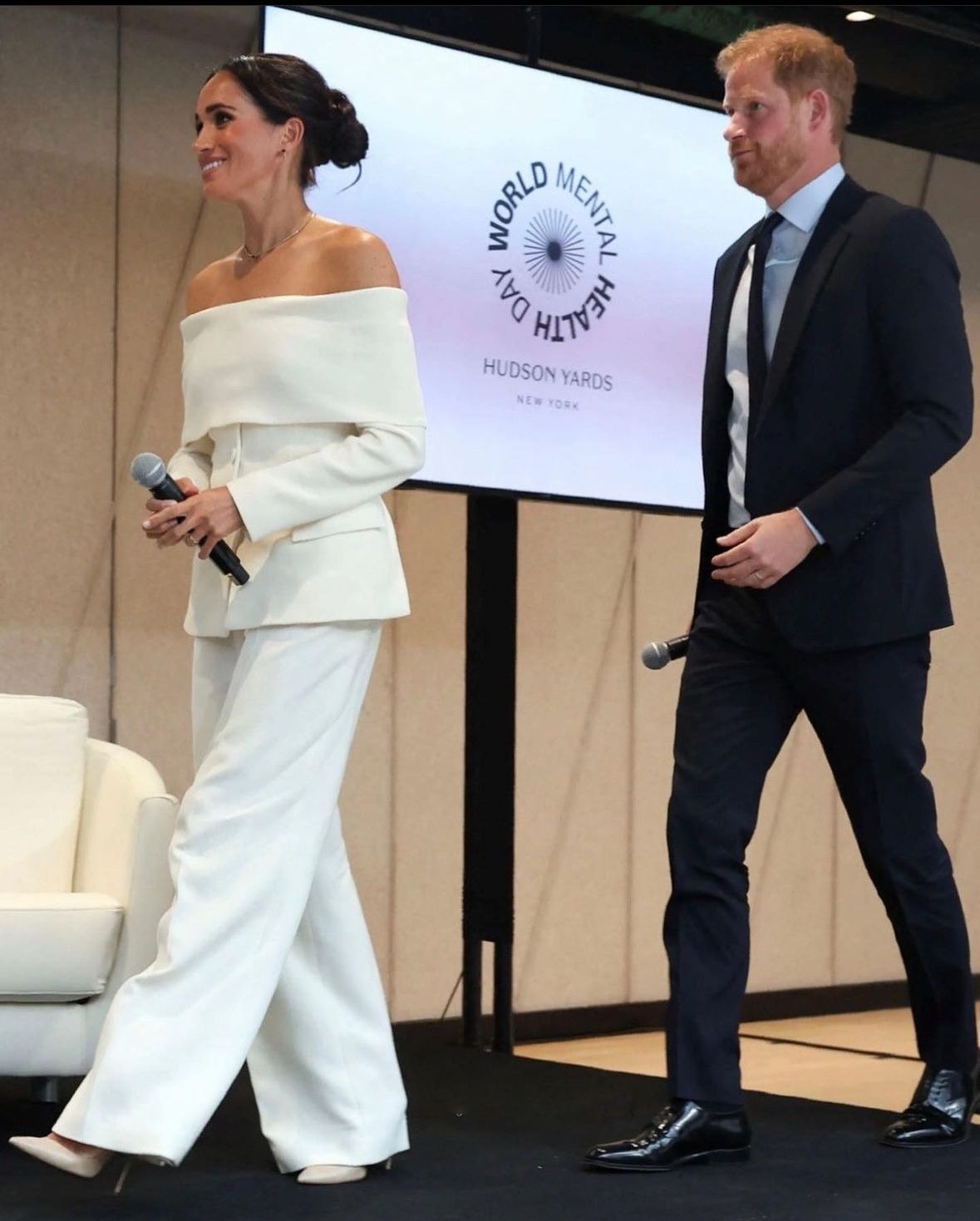 Trong một sự kiện tháng 10/2023, cô diện thiết kế của Joseph Altuzarra, gồm áo trễ vai 625 bảng (21,8 triệu đồng) và quần ống rộng 310 bảng (10,8 triệu đồng), phối đồng điệu giày mũi nhọn. Ảnh: Pinterest