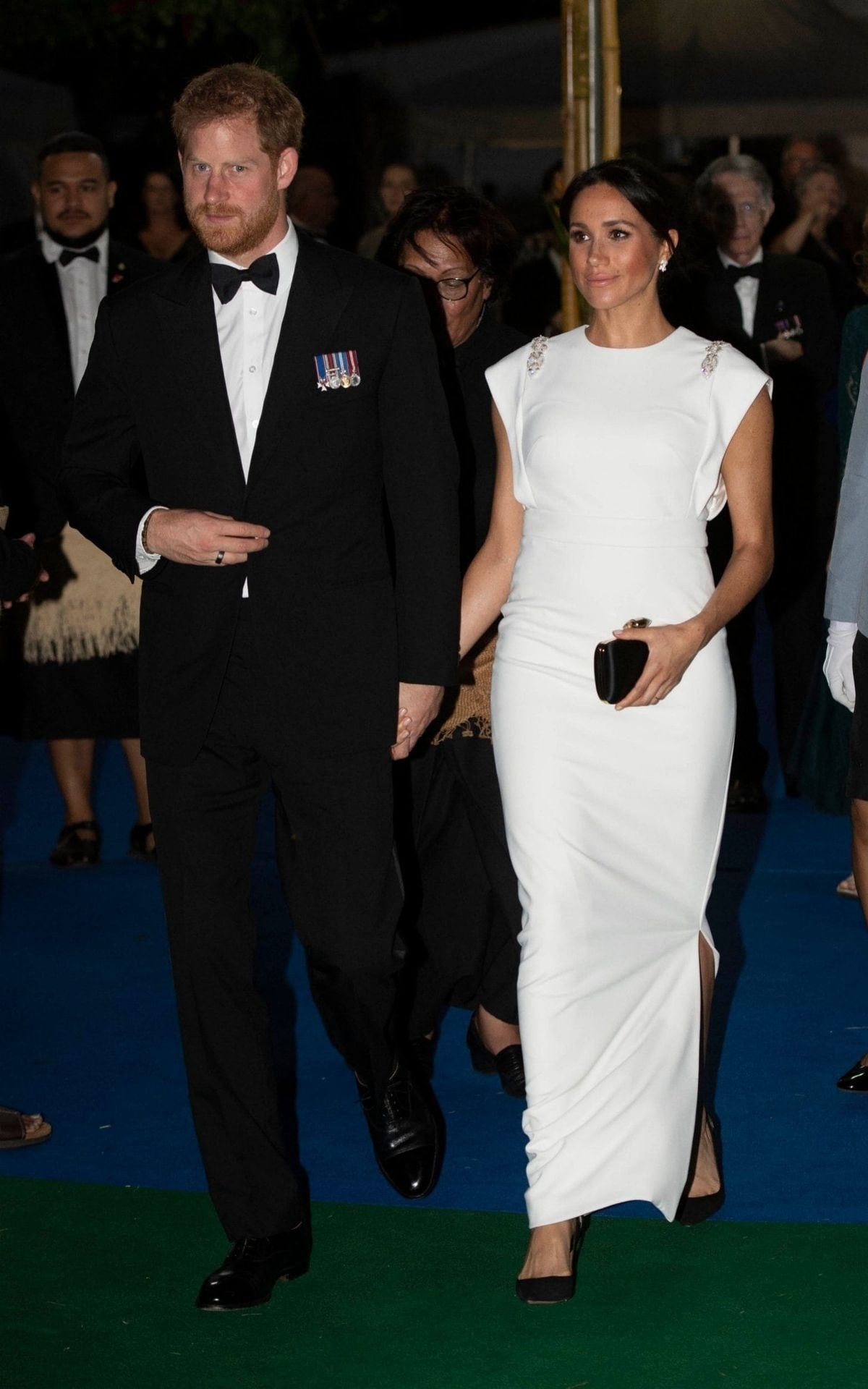 Nữ công tước xứ Sussex cùng chồng tham dự tiệc tối cấp nhà nước tại Dinh thự Hoàng gia ở Nuku'alofa, Tonga. Cô đặt may váy của hãng Theia làm từ vải crepe. Thiết kế dáng cột nhấn vào phần vai chờm, đính thủ công pha lê và hạt thủy tinh siêu nhỏ. Megan phối đầm cùng hoa tai kim cương của thương hiệu Birks thuộc bộ sưu tập Snowflake, mang giày Aquazzura và ví cầm tay satin Givenchy. Ảnh: Backgrid