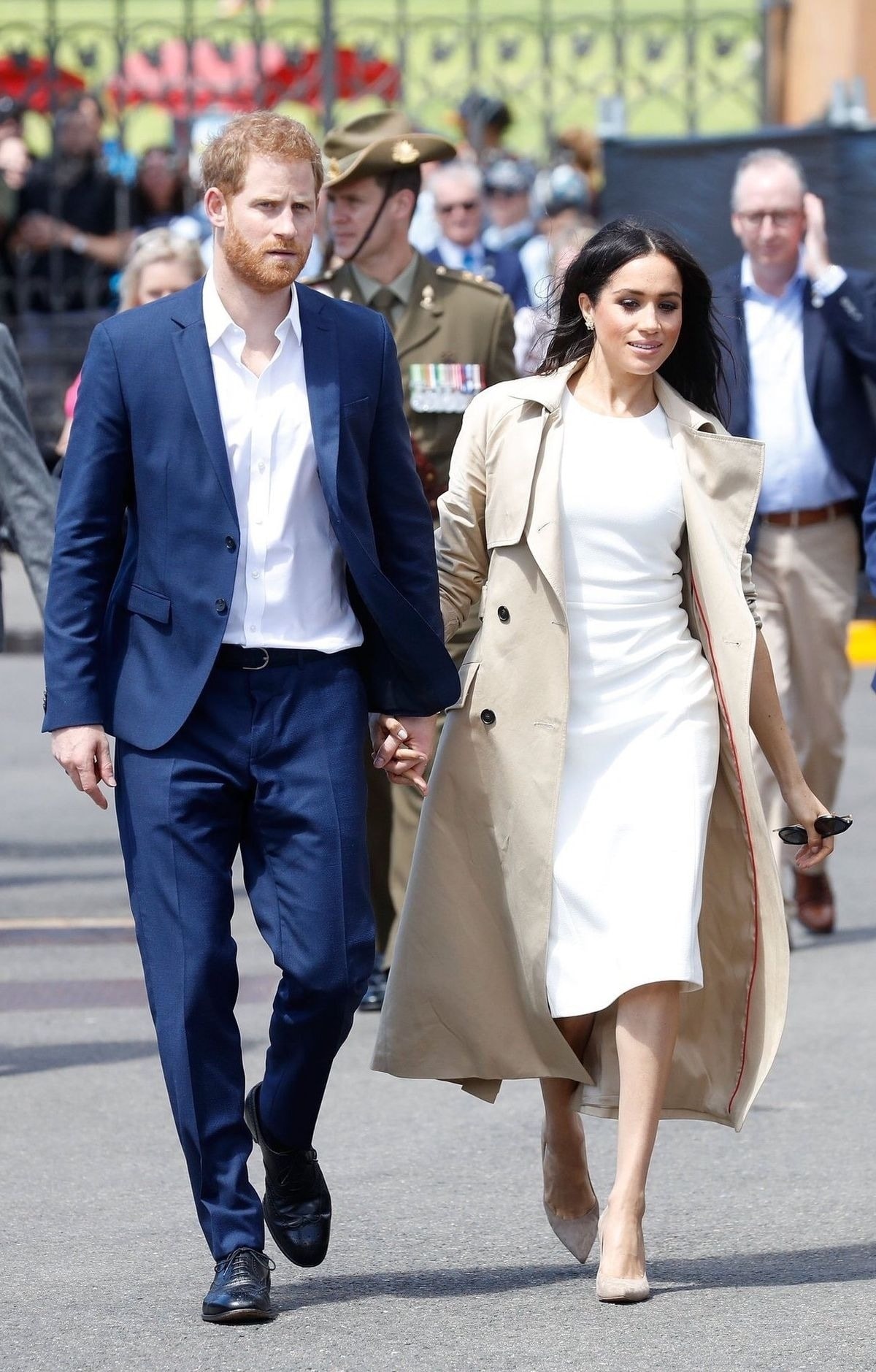 Đầm chữ A tối giản là một trong những thiết kế được Megan diện nhiều nhất vì tiện lợi. Trong một sự kiện mùa thu, cô phối váy cùng trench coat và giày da lộn. Theo Vogue, phong cách đơn giản này mang đậm chất Anh. Ảnh: GC Images