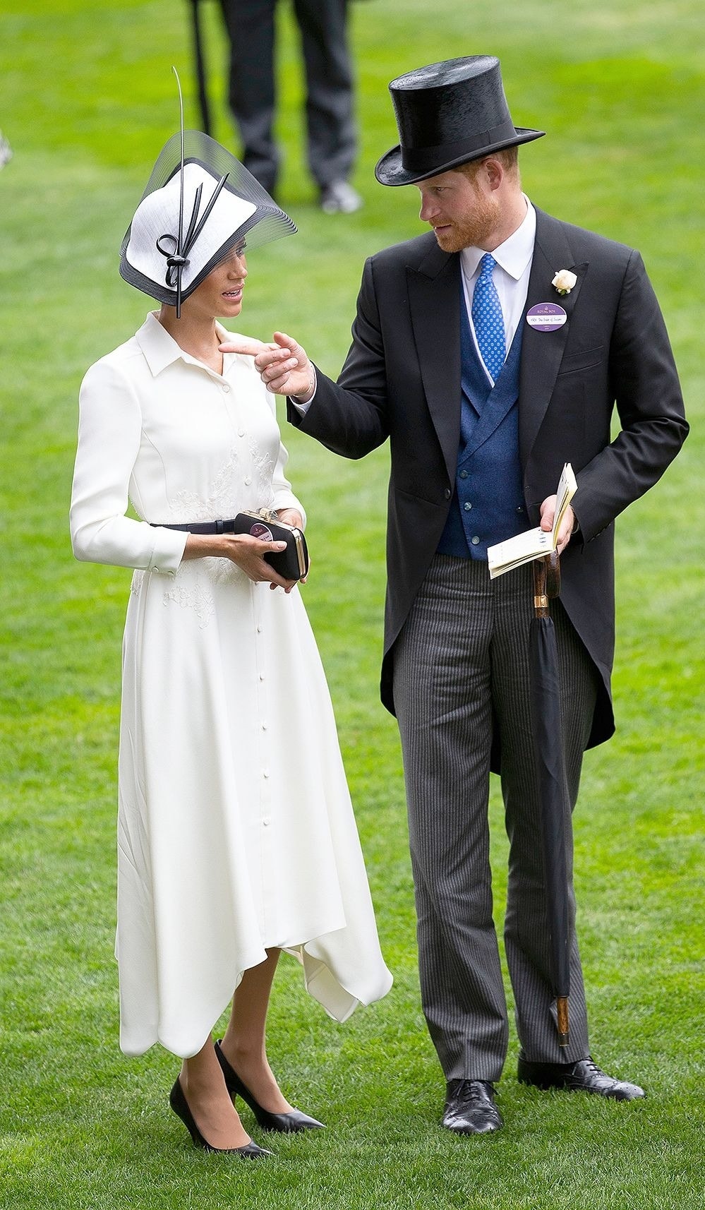 Tại lễ hội Royal Ascot đầu năm 2018, Megan Markle diện bộ đầm sơ mi gợi nhớ đến diện mạo kinh điển của Audrey Hepburn trong vở nhạc kịch My Fair Lady năm 1964. Megan kết hợp váy đơn giản cùng thắt lưng đen, mũ fascinator đen trắng tương tự nhưng nhỏ hơn chiếc Hepburn đội trong phim. Ảnh: Celebmafia