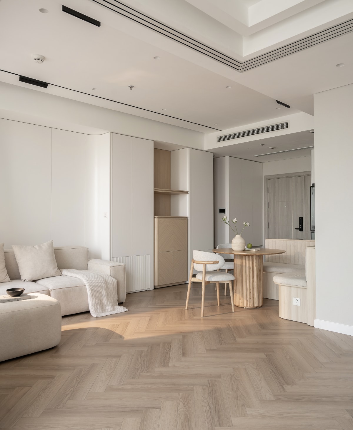 Hệ vách kính di động thay thế tường cố định, giúp gia chủ dễ dàng chuyển đổi không gian sinh hoạt chung thành phòng làm việc riêng tư.
