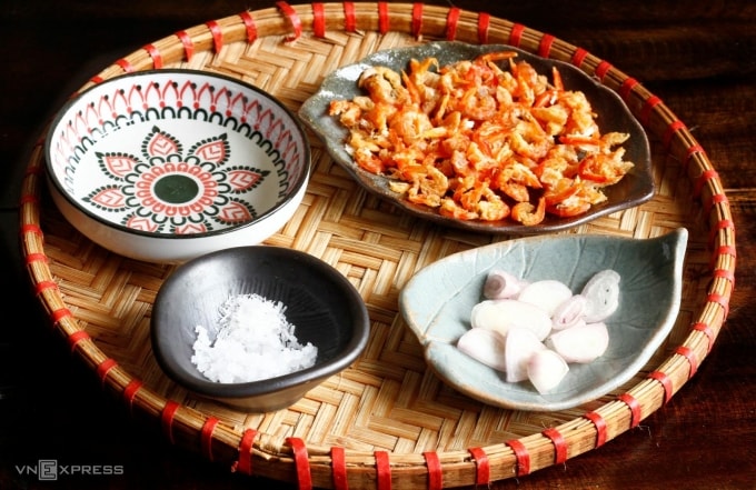 Chuẩn bị các nguyên liệu khác: Tôm khô ngâm nước ấm 8-10 phút cho mềm. Vớt ra, để ráo, cho vào cối giã hoặc máy xay nhỏ. Phần nước ngâm tôm giữ lại, lọc cặn để dùng nấu canh thêm vị ngọt tự nhiên. Hành khô bóc vỏ, thái lát mỏng. Hành lá rửa sạch, thái nhỏ.