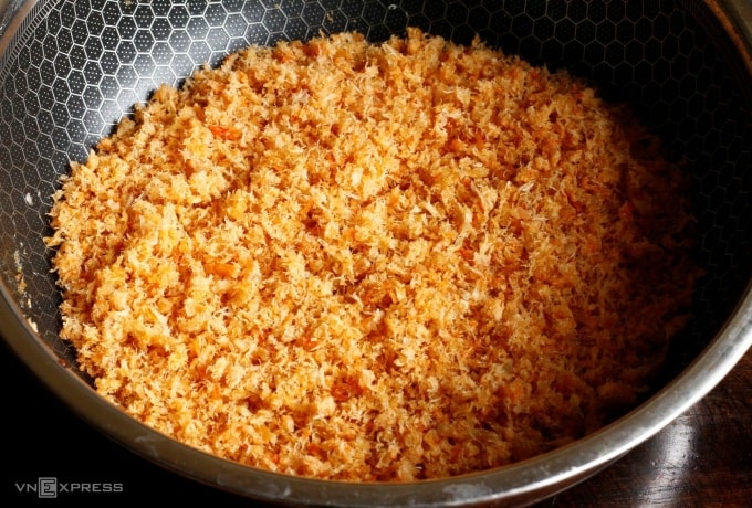 Sao tôm: Phi thơm hành khô với chút mỡ lợn cho thơm, cho tôm đã xay hoặc giã nhỏ vào đảo đều, nêm chút mắm, muối cho đậm vị. Khi tôm khô ráo, bông sợi là được.