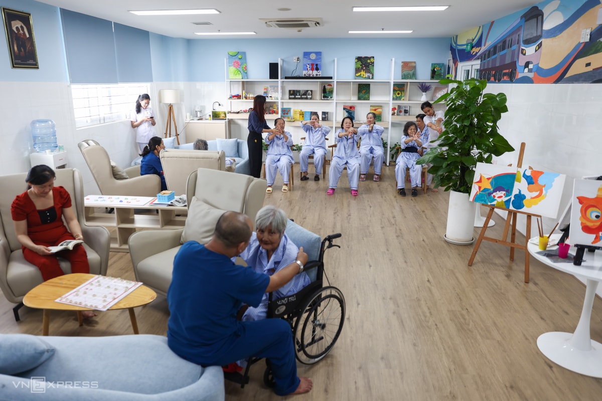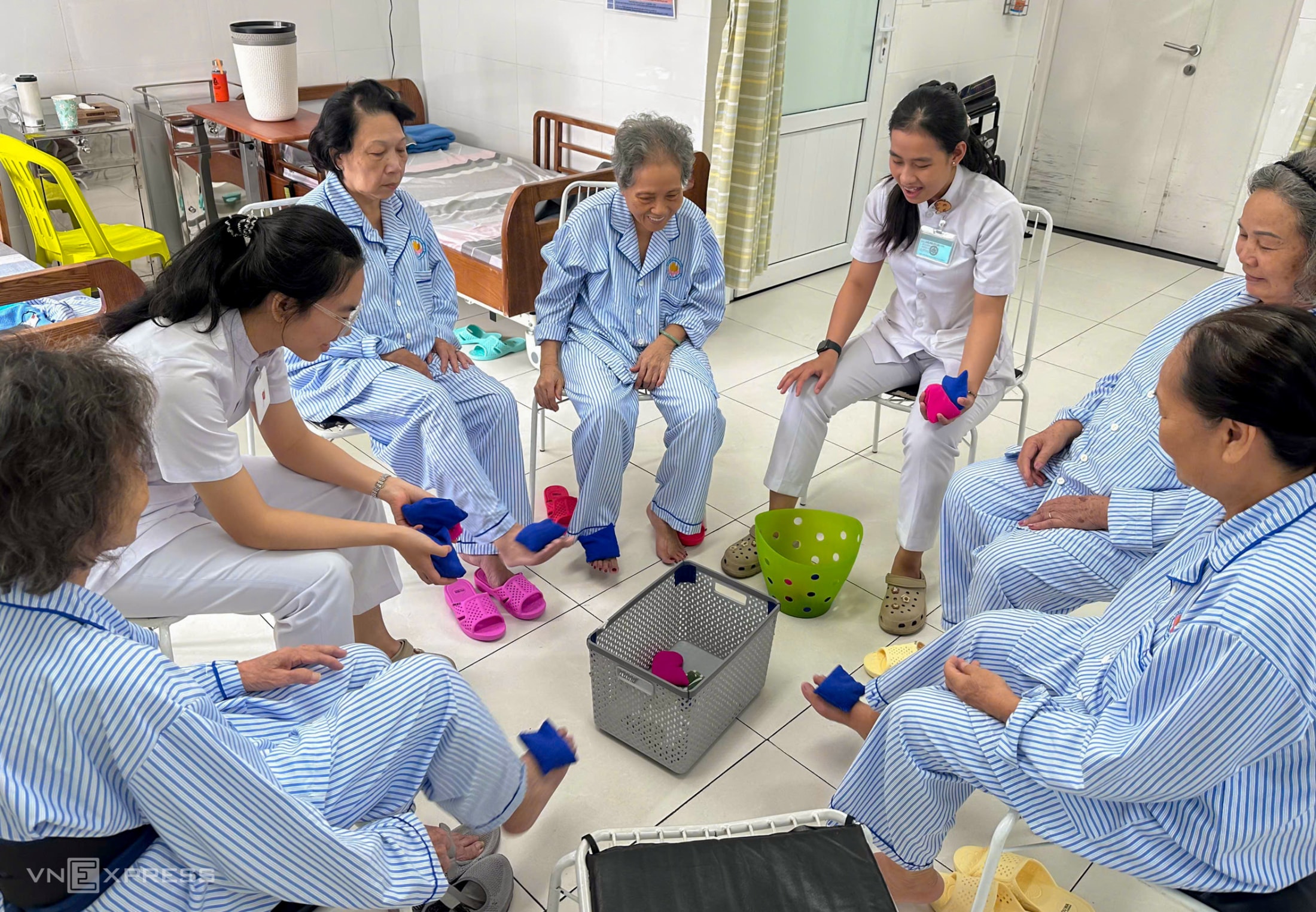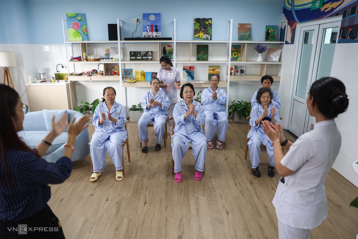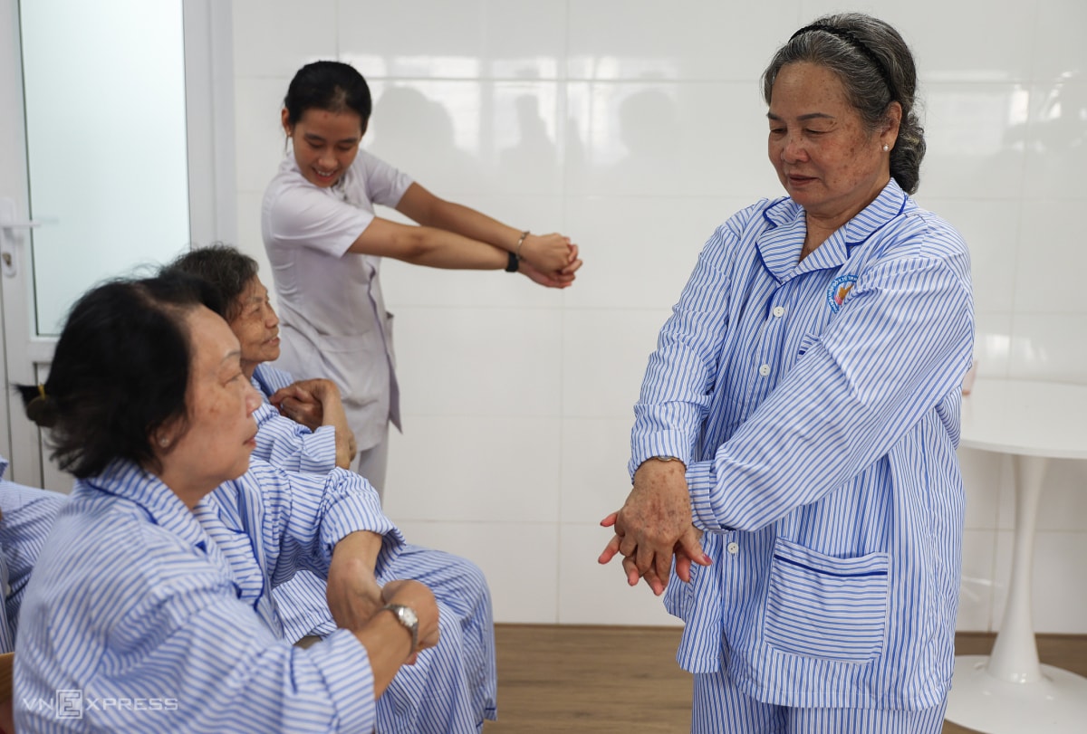 Bà Len, cùng 20 người khác đều trên 70 tuổi, mỗi ngày được con cháu đưa đến Bệnh viện Phục hồi chức năng theo dịch vụ dưỡng lão "sáng đi chiều về", bắt đầu từ 8h.